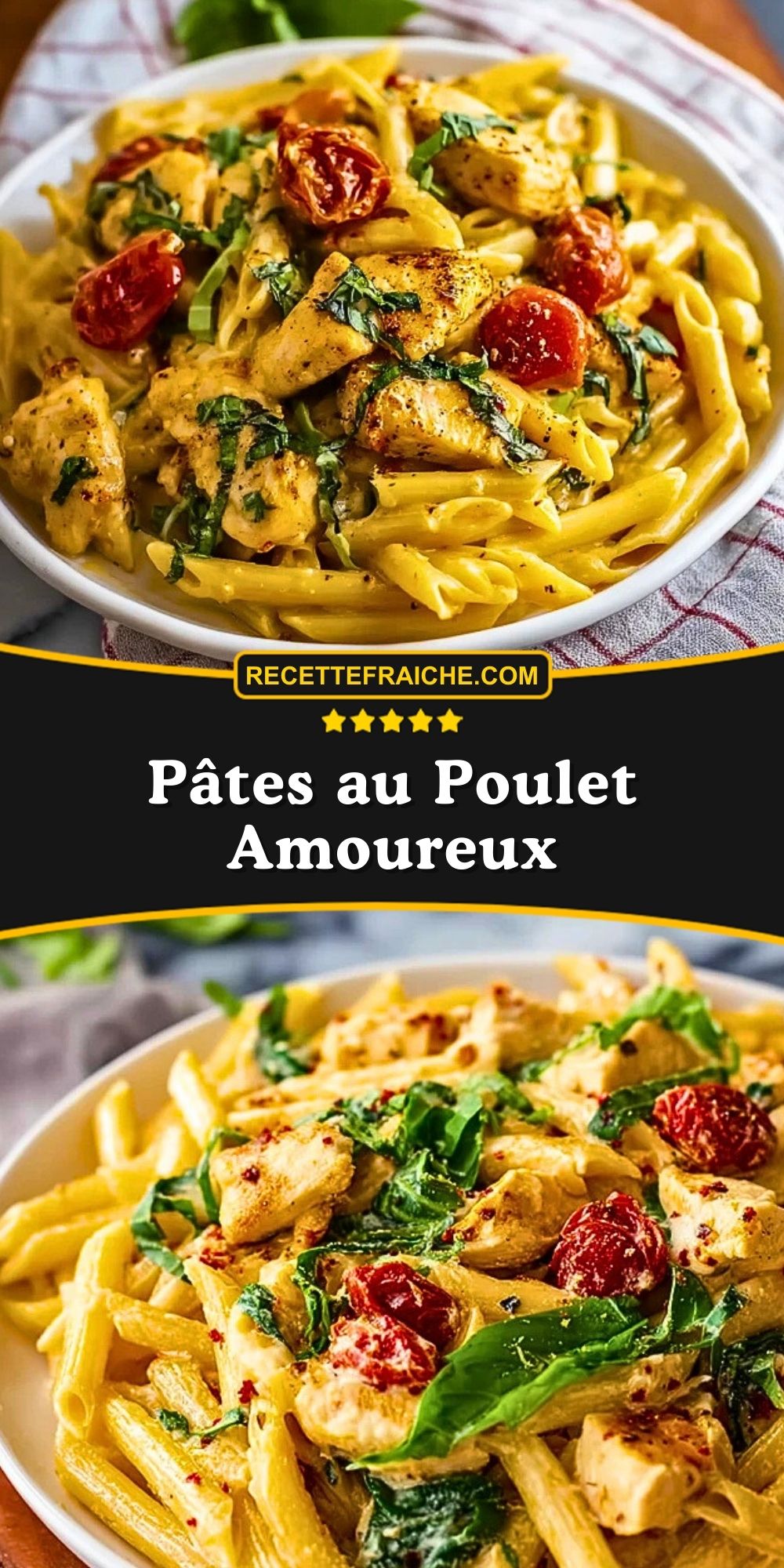 Keywords: pâtes poulet, recette rapide, sauce crémeuse, plat romantique, tomates séchées