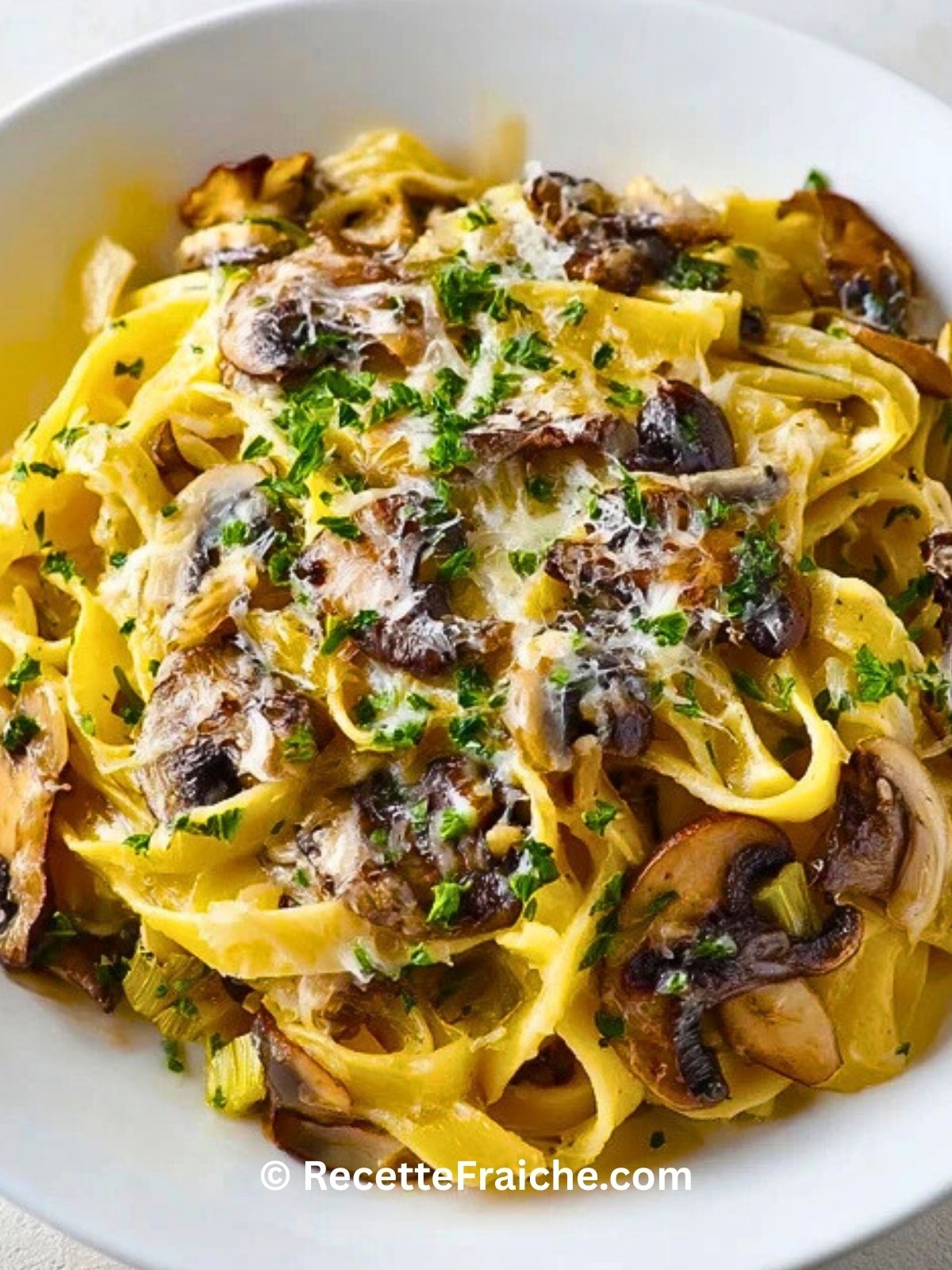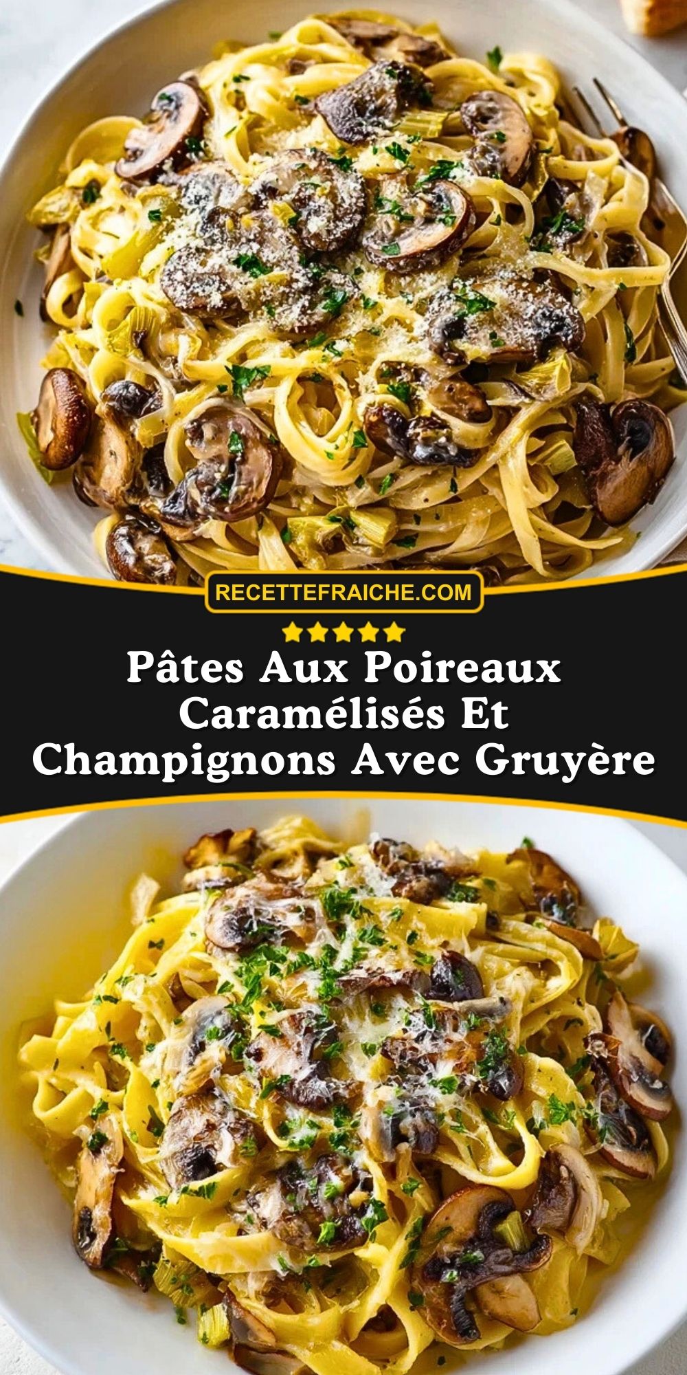 Keywords: pâtes poireaux champignons, recette végétarienne, pâtes crémeuses, gruyère, plat rapide