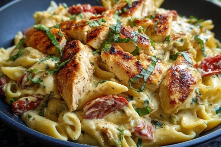 Un plat de pâtes crémeuses au poulet tendre, tomates cerises et champignons, enrobé d’une sauce onctueuse au parmesan. Parfait pour un dîner convivial, ce plat généreux se prépare rapidement et régale toute la famille. (pâtes poulet crémeux, recette facile, plat familial, cuisine rapide)