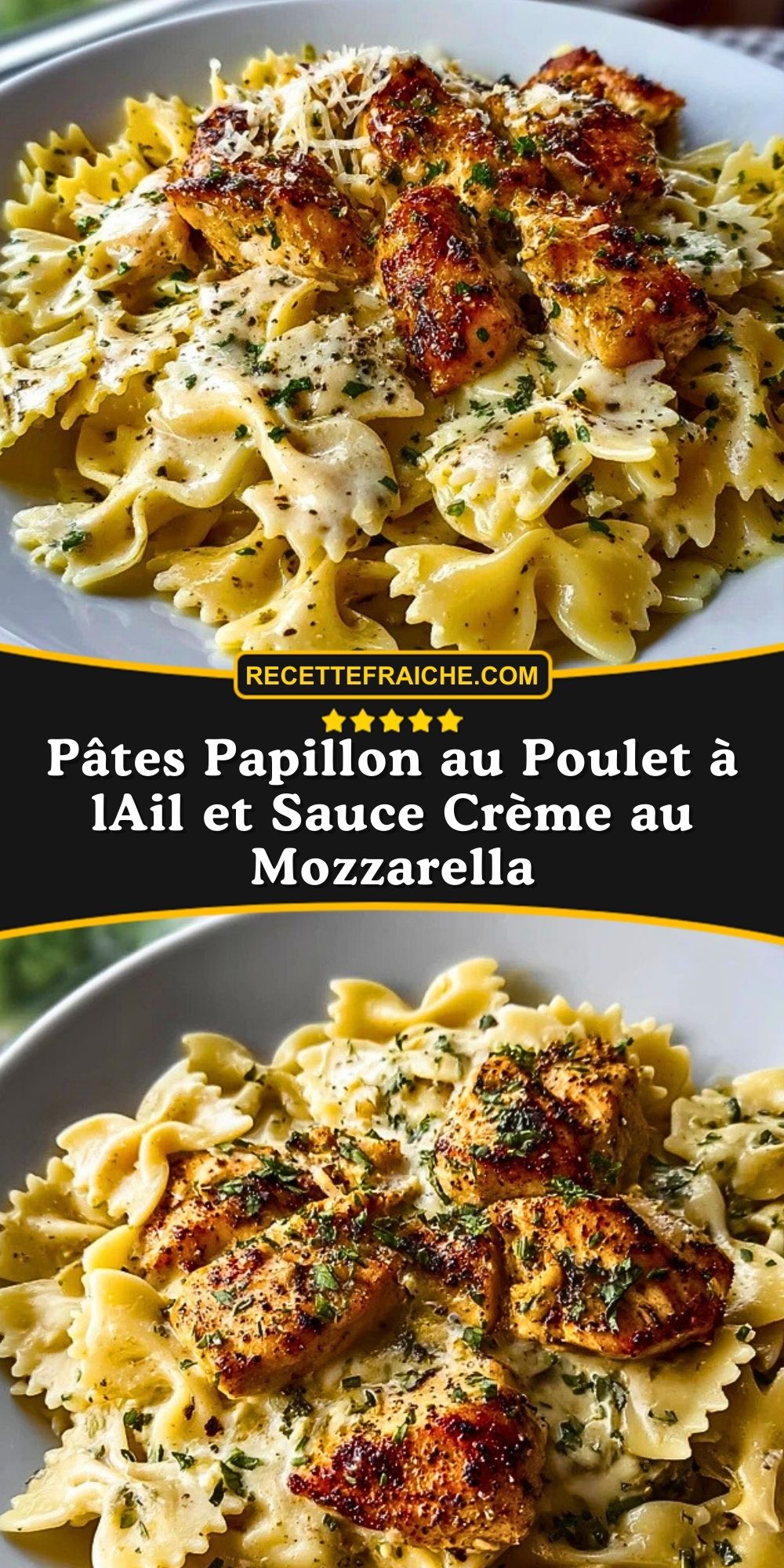 Keywords: pâtes papillon, poulet à l’ail, sauce crème mozzarella, pâtes crémeuses, dîner rapide