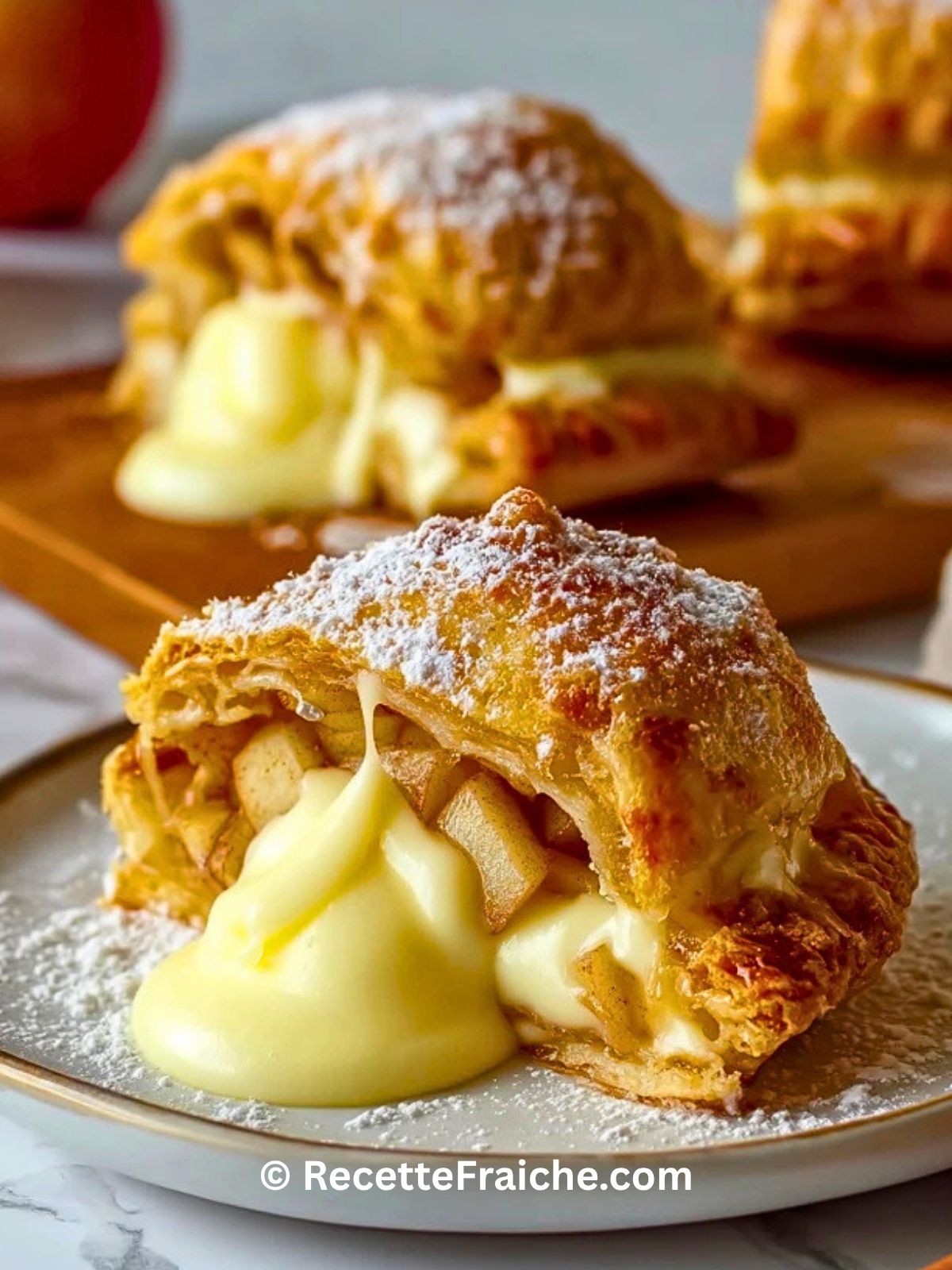 Enfournez pendant 18 à 22 minutes, jusqu’à ce que les Pâtisseries Aux Pommes Fourrées Au Fromage Crémeux soient bien gonflées et dorées. Laissez reposer quelques minutes avant de servir, puis ajoutez un voile de sucre glace pour la touche finale.