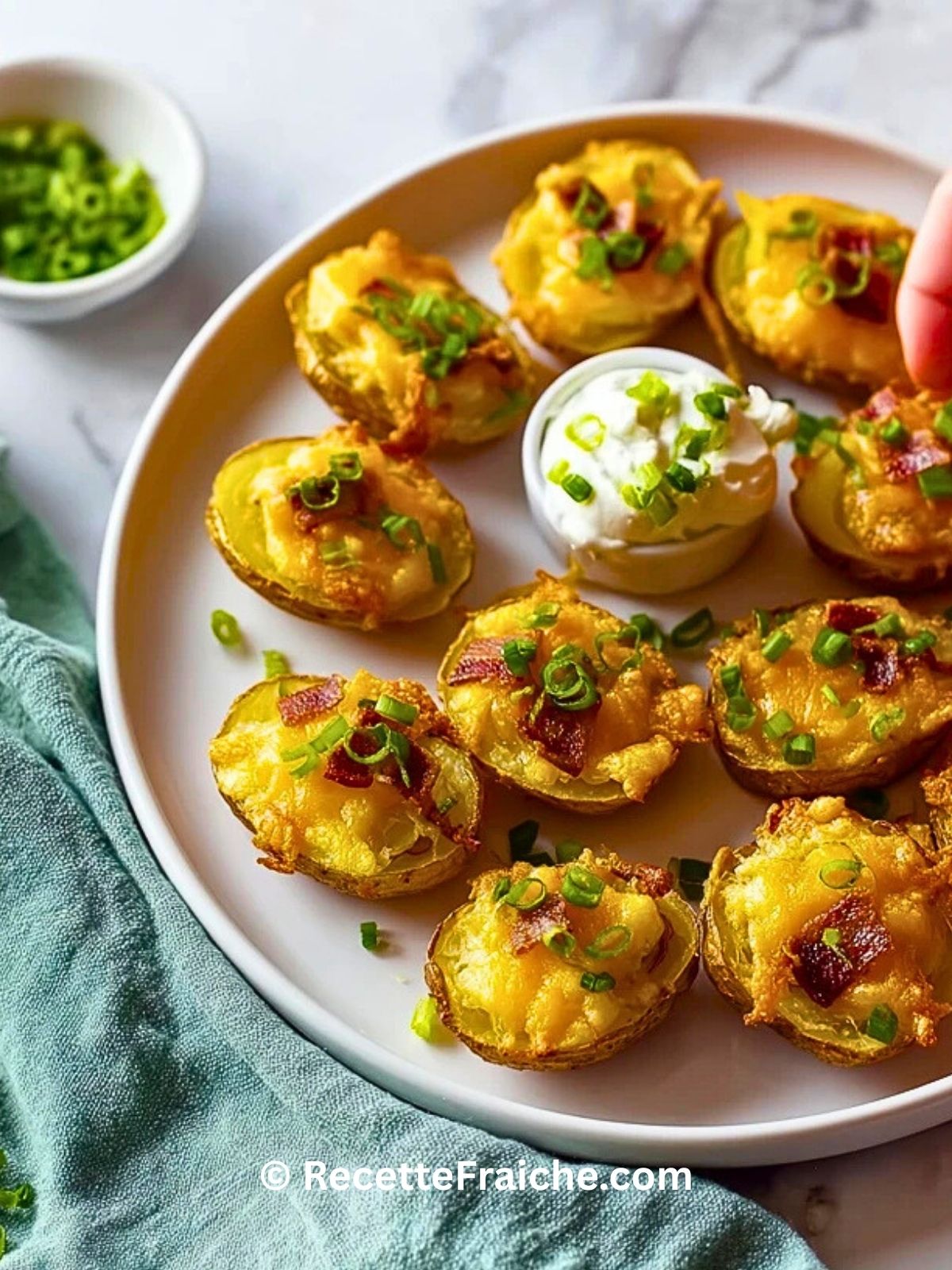 Ces peaux de pommes de terre croustillantes miniatures sont parfaites pour l’apéritif : de petites pommes de terre grenaille dorées au four, garnies de cheddar fondant, de bacon fumé, de crème fraîche, d’oignon rouge et de ciboulette. Une recette facile, économique et gourmande, idéale pour un apéro convivial ou un buffet dinatoire.