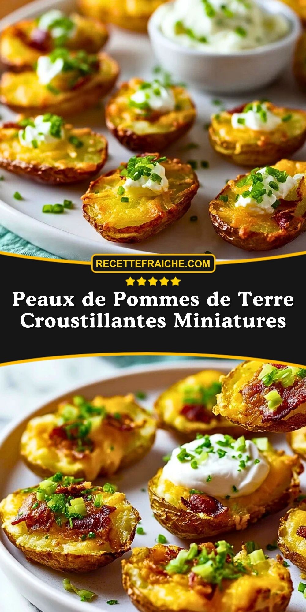 Quand j’ai envie d’un apéritif ultra gourmand sans passer des heures en cuisine, je pense tout de suite à ces peaux de pommes de terre croustillantes miniatures. Elles ont ce côté convivial qui fait que tout le monde se sert directement dans le plat, en chipant une bouchée bien dorée, recouverte de fromage fondant, de bacon fumé et d’une cuillerée de crème fraîche.