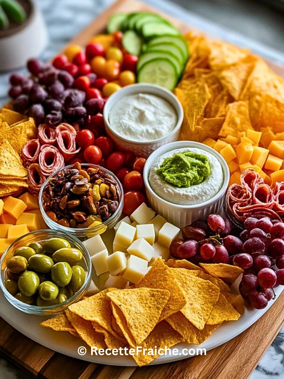 Choisissez une grande planche ou un plateau. Commencez par placer les petits bols (olives, guacamole, graines) puis répartissez harmonieusement les différents éléments tout autour : chips, charcuterie, fromages, fruits et légumes. Pensez à alterner couleurs et textures pour un effet visuel réussi.