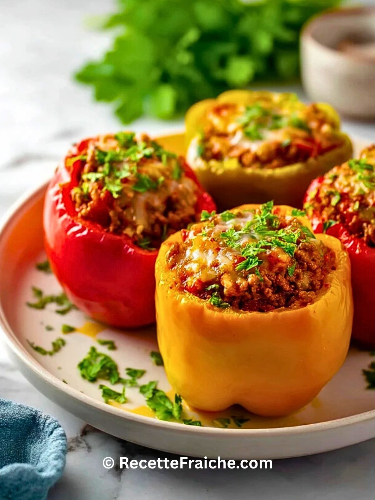 Dans cette recette, j’adore la façon dont les poivrons restent légèrement croquants tout en étant bien garnis d’une farce généreuse, savoureuse et moelleuse. Avec un peu de riz, de sauce tomate et de fromage, on obtient un plat complet, coloré et ultra convivial qui plaît autant aux enfants qu’aux adultes.