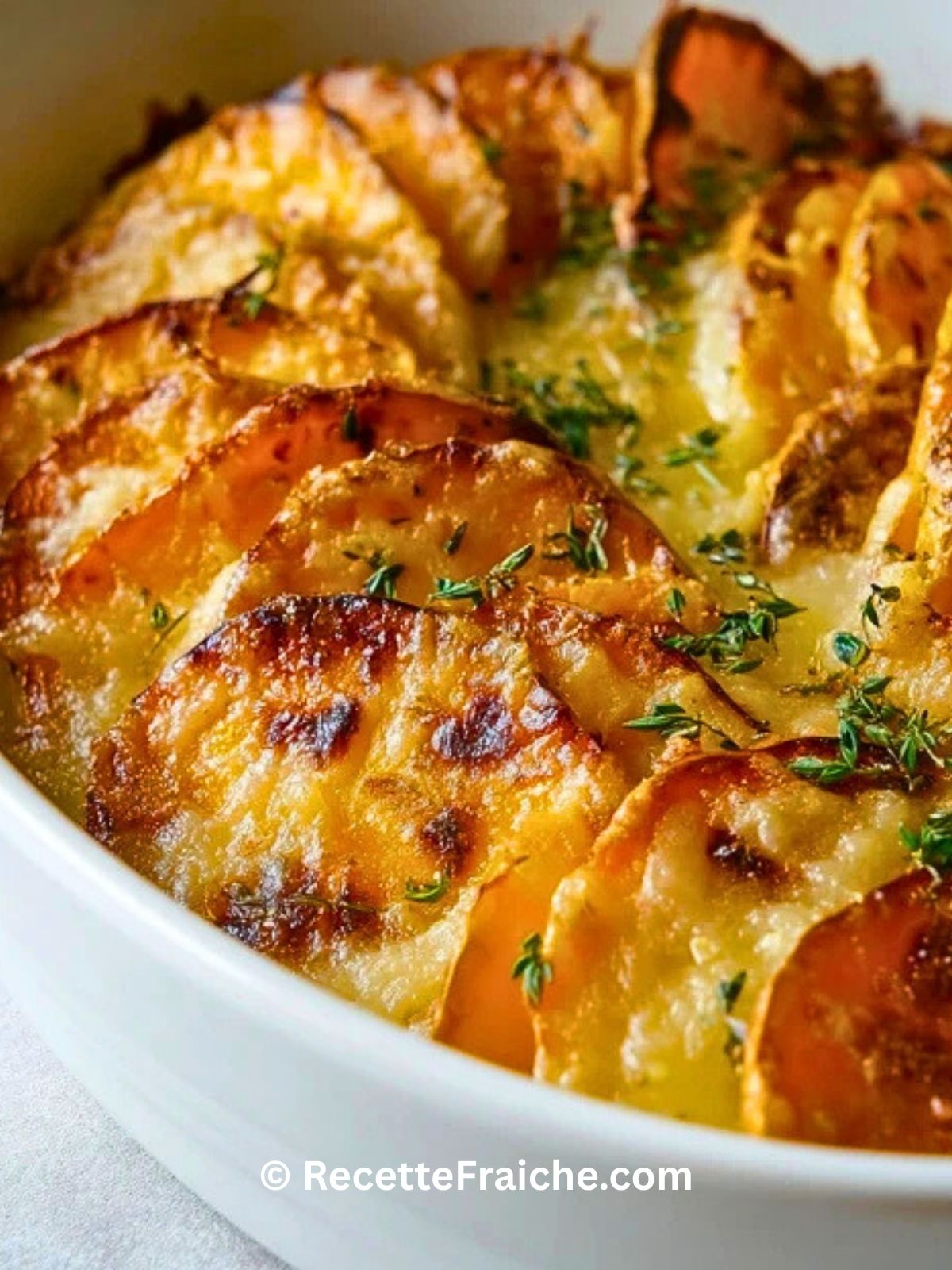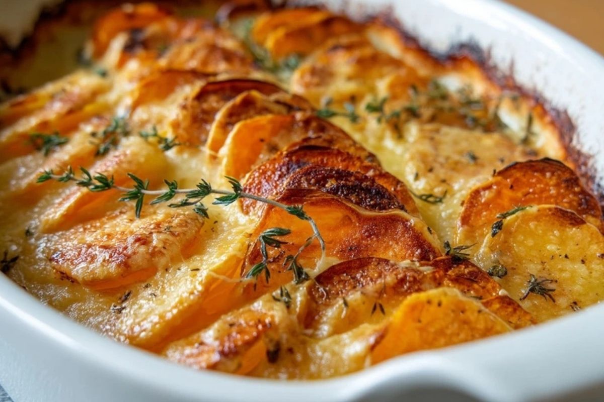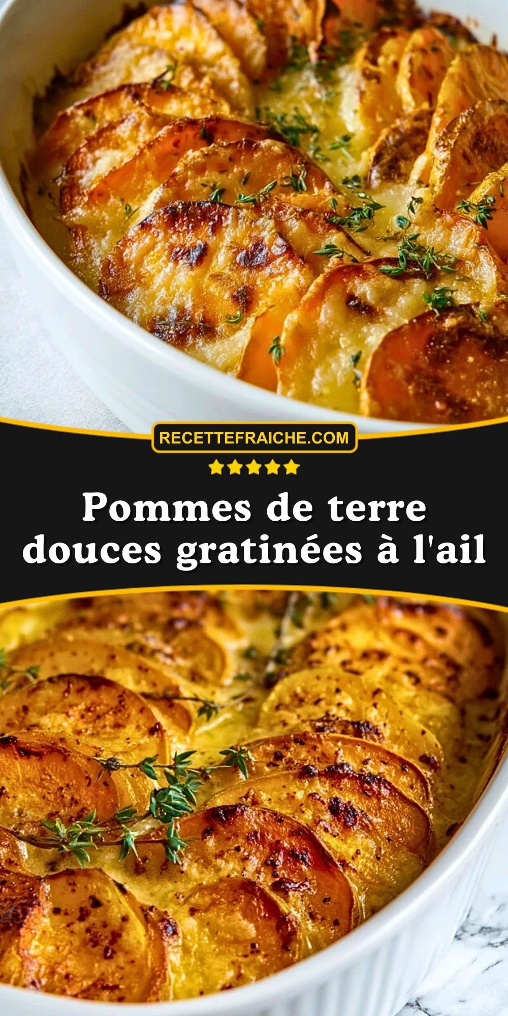 Pommes de terre douces gratinées à l’ail : un gratin fondant et parfumé, associant patates douces, pommes de terre, ail, crème et parmesan. Parfait pour accompagner vos repas en toute saison.