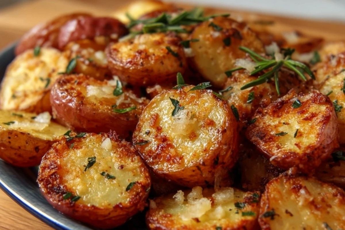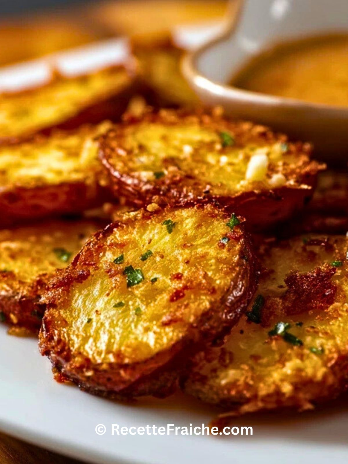 Pommes de terre rouges écrasées, dorées et croustillantes au four avec ail, herbes fraîches et un soupçon de parmesan. Facile, ultra savoureux, parfait en accompagnement pour toutes les occasions !
