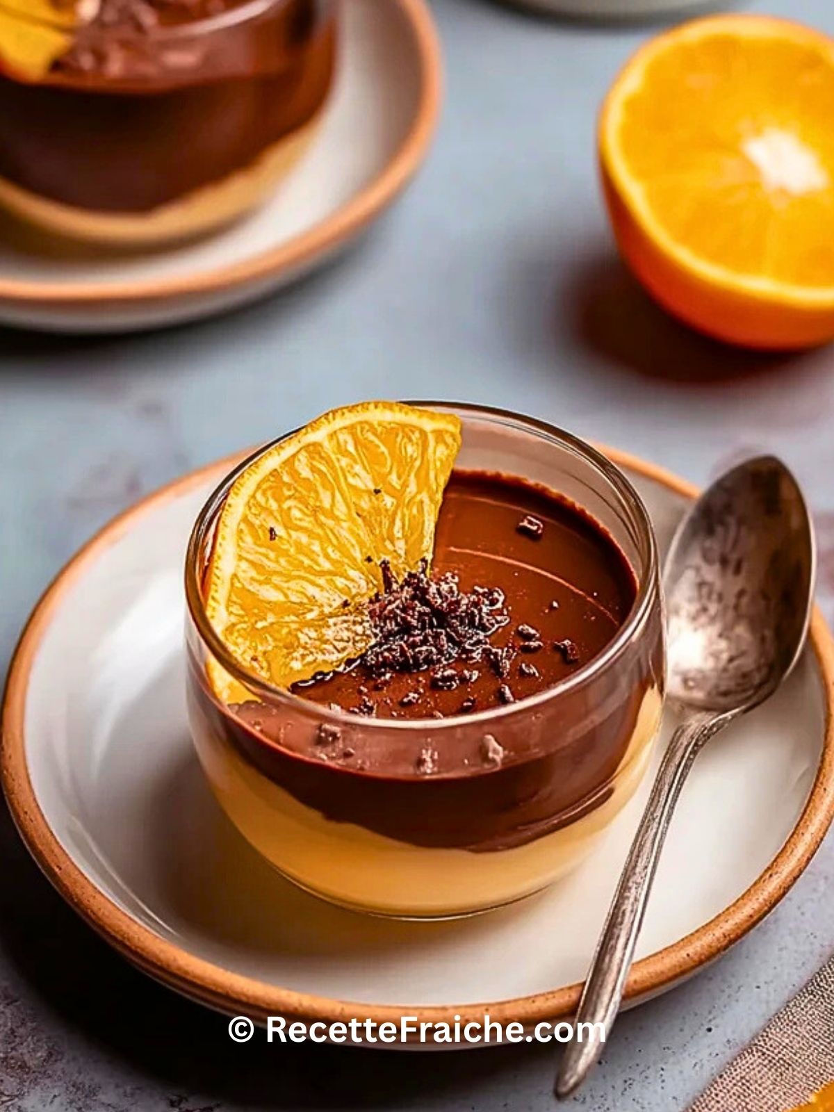 9. Juste avant de servir, décorer chaque verrine d’une rondelle d’orange, de copeaux de chocolat ou de zeste supplémentaire, puis servir bien frais.