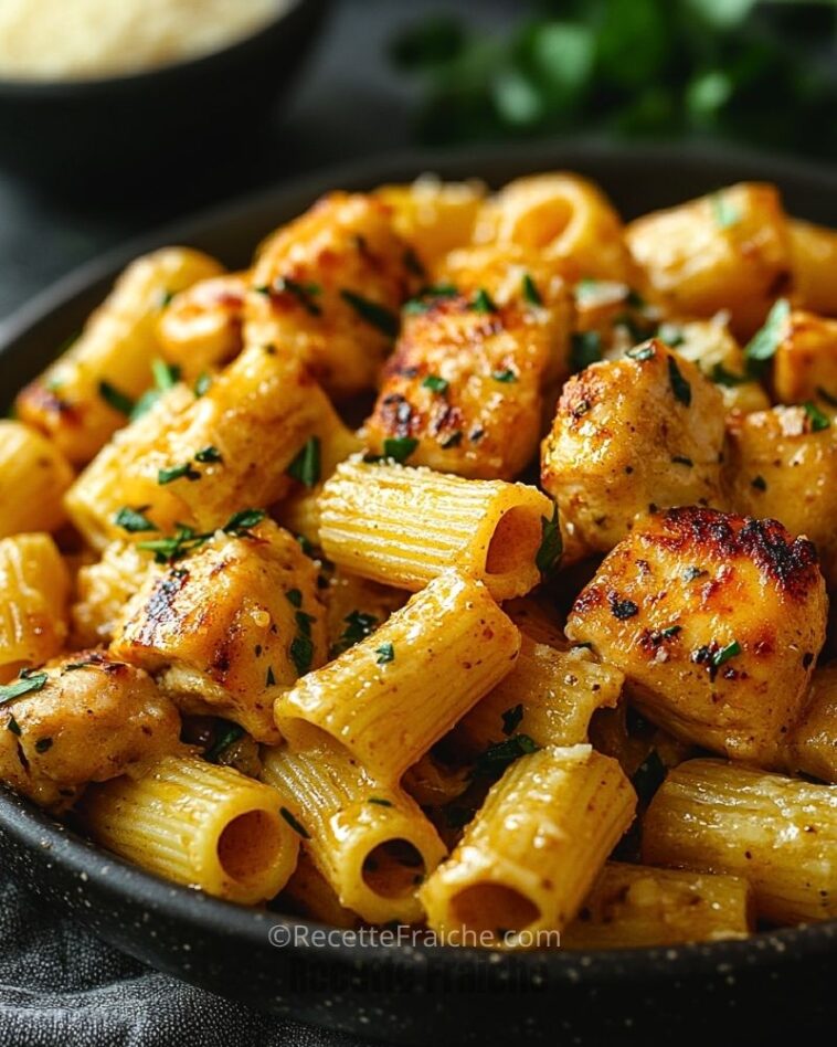 Ce que j’aime particulièrement dans cette recette, c’est qu’elle utilise des ingrédients basiques mais savoureux, sublimés par une cuisson parfaitement maîtrisée. Les rigatoni absorbent la sauce crémeuse, le poulet est tendre et bien doré, et l’ail vient parfumer l’ensemble d’une touche irrésistible. Croyez-moi, une fois que vous aurez goûté à cette assiette, vous aurez envie de la refaire encore et encore !