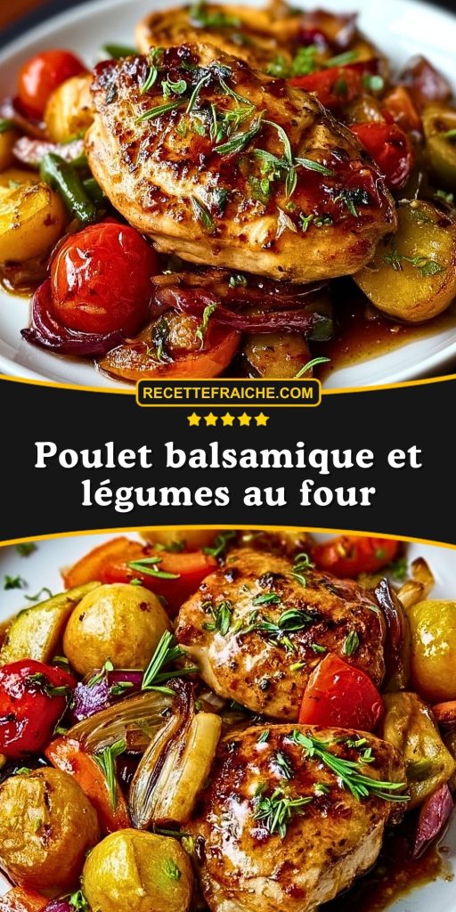 Un plat complet, sain et savoureux : poulet rôti au four avec légumes de saison, nappé d’une sauce balsamique parfumée et légèrement caramélisée. Parfait pour un dîner familial simple et équilibré.