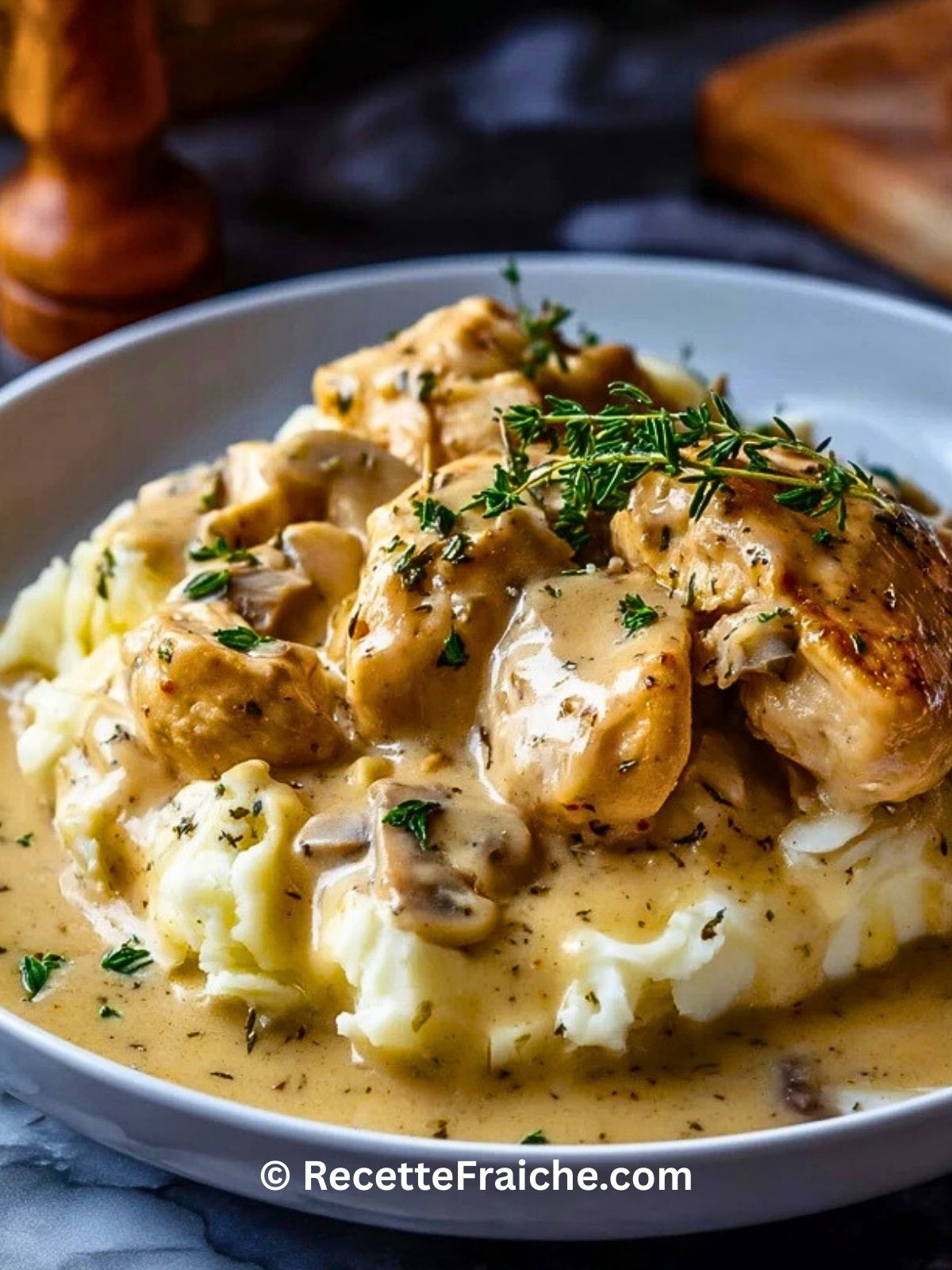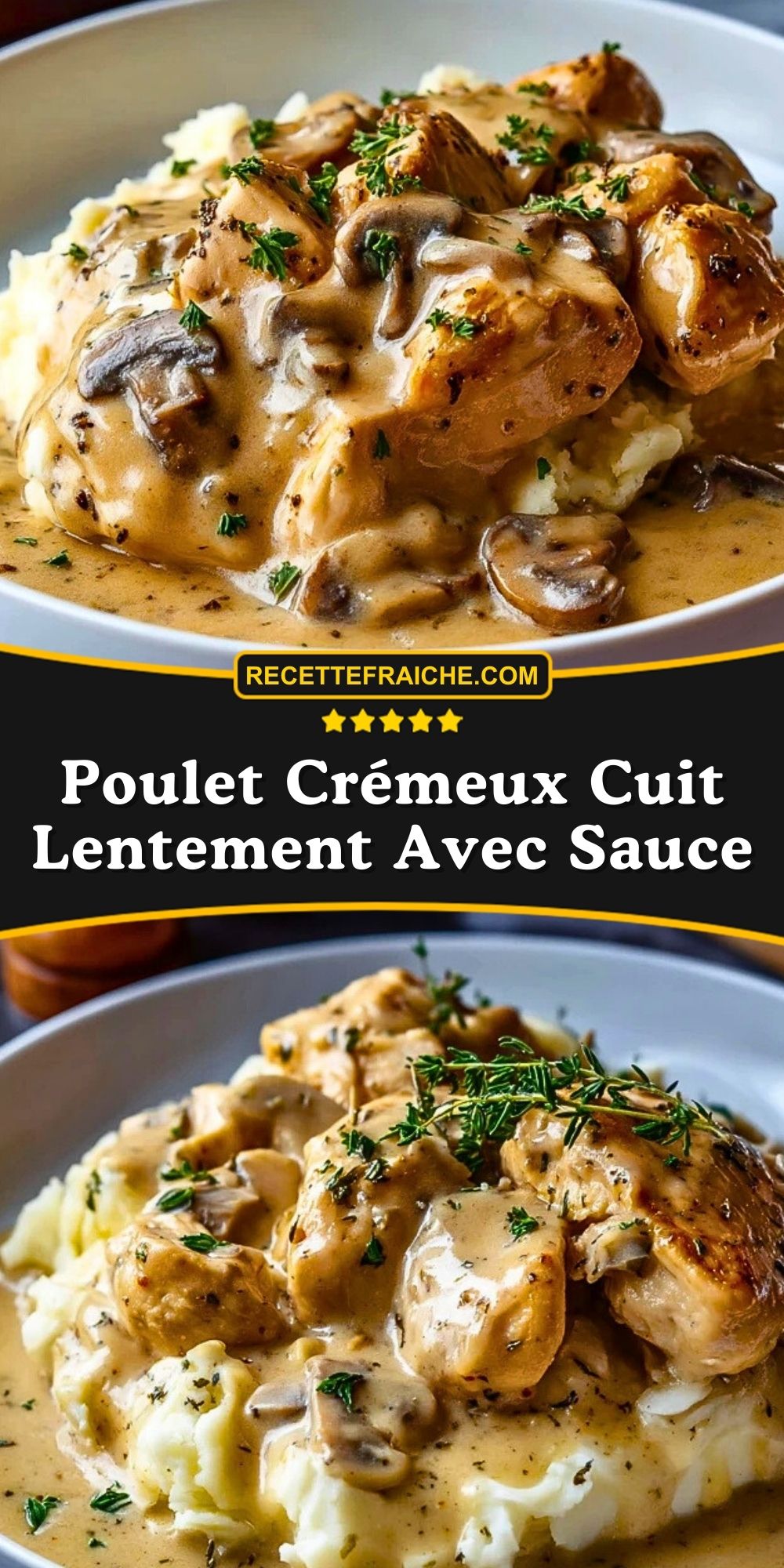 Poulet crémeux cuit lentement avec une sauce onctueuse aux champignons, ail et herbes, préparé en mijoteuse ou en cocotte. La viande reste ultra tendre, nappée d’une sauce riche parfaite avec une purée maison ou des pâtes. Un plat familial réconfortant et simple, idéal pour les soirs de semaine.