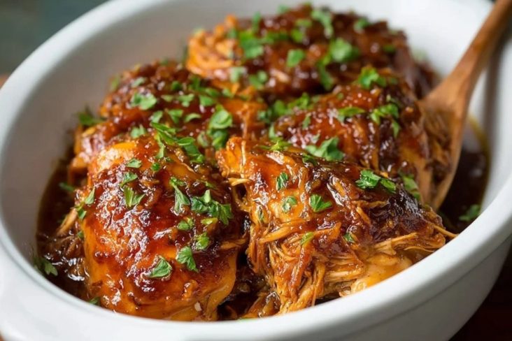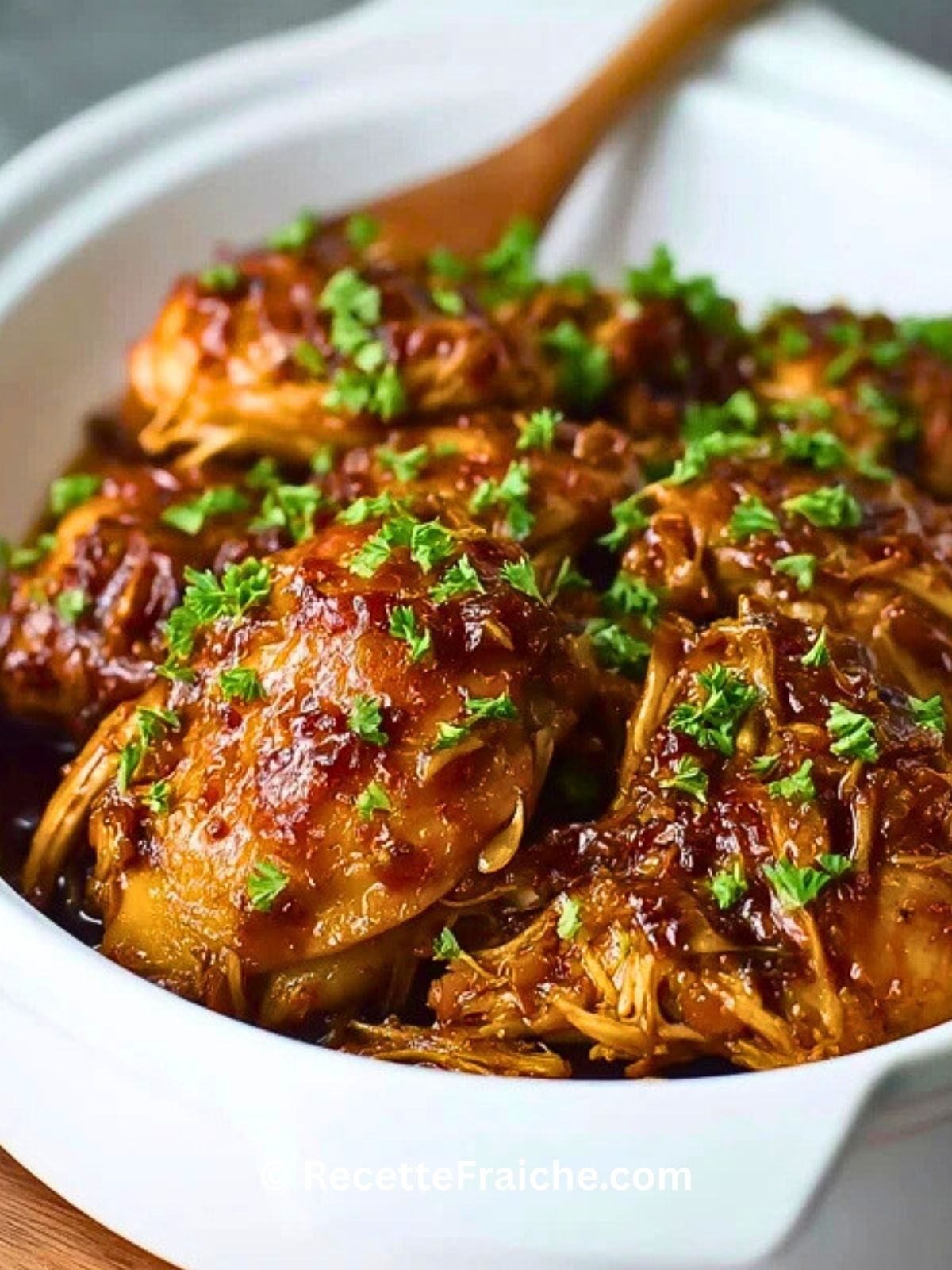 4. Remettre le poulet dans la mijoteuse, bien enrober de sauce épaisse. Servir chaud, parsemé de persil frais.