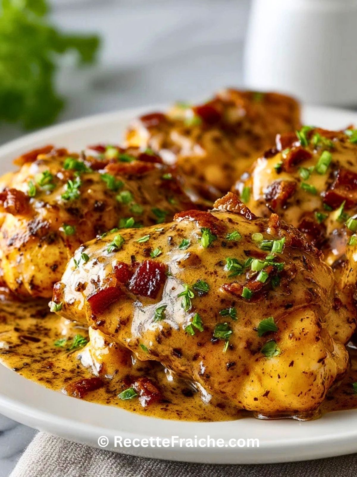 Évitez de cuire le poulet directement à feu trop fort, car il risquerait de brunir trop vite à l’extérieur tout en restant insuffisamment cuit au centre. Ne salez pas trop dès le départ, surtout avec la présence du bacon et du bouillon. N’ajoutez pas le fromage à la crème dans une poêle trop chaude sans liquide, sinon il peut former des petits morceaux. Enfin, ne laissez pas la sauce bouillir fortement trop longtemps pour préserver sa texture crémeuse.