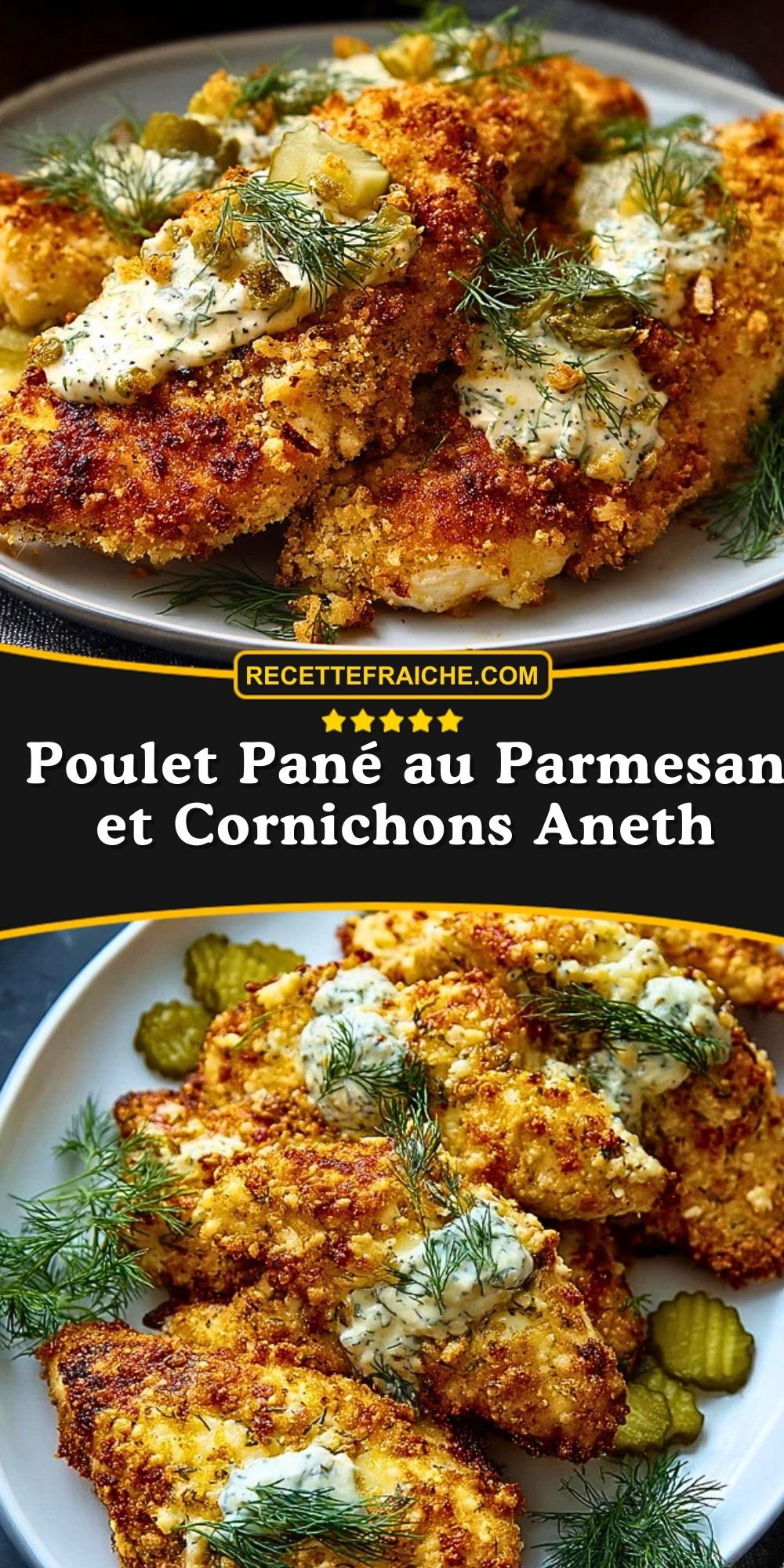 Keywords: poulet pané, parmesan, aneth, cornichons, recette facile, croustillant