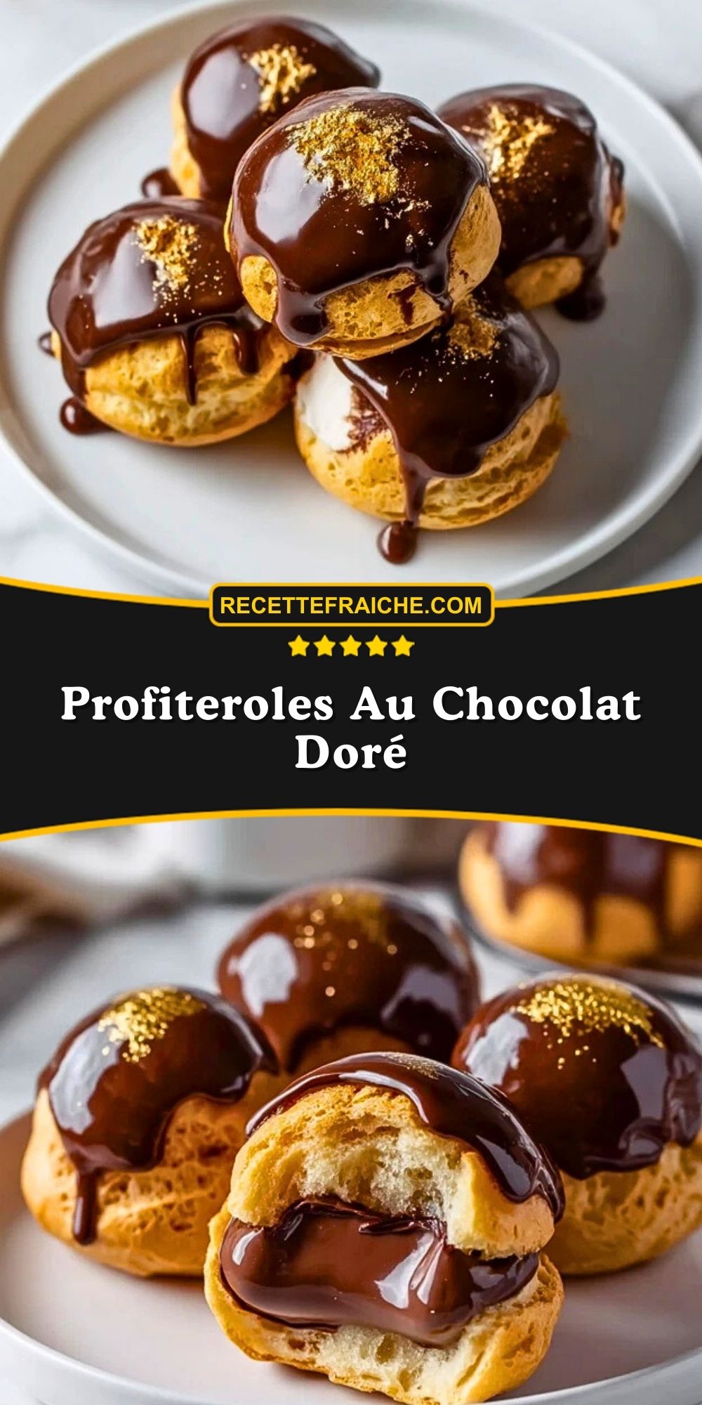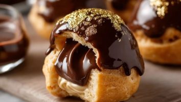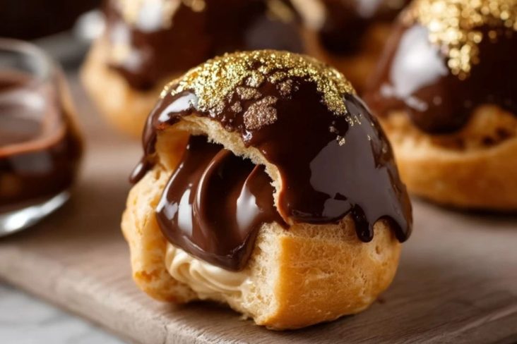 Les profiteroles au chocolat doré sont un dessert spectaculaire et festif, parfait pour impressionner lors d’un dîner ou d’une occasion spéciale. Leur pâte légère, la générosité de la crème et la sauce chocolat brillante en font une expérience irrésistible. Et la touche d’or comestible les rend tout simplement inoubliables !