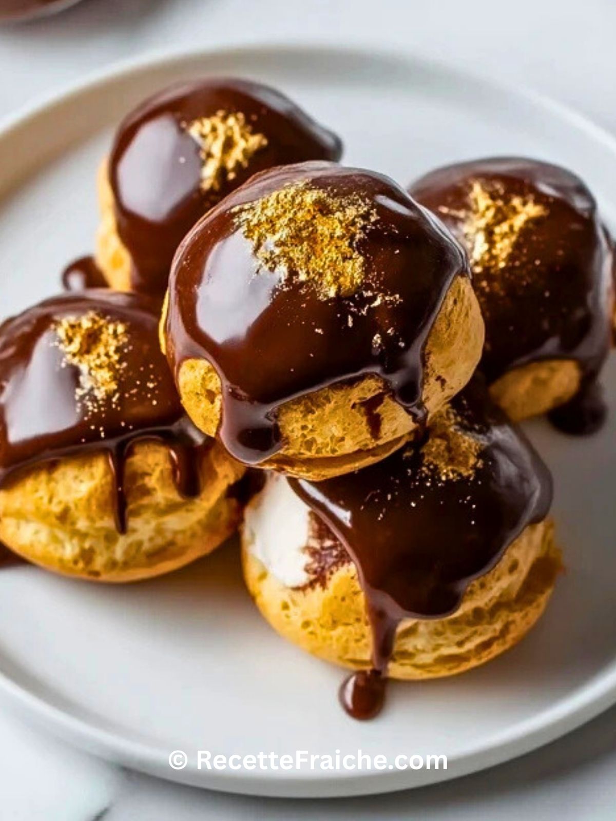 Profiteroles au chocolat doré, un dessert chic et festif. Pâte à choux légère, crème vanille onctueuse, nappage chocolat intense et éclats d’or comestible. Idéal pour épater vos invités à toute occasion, facile à préparer et absolument irrésistible.