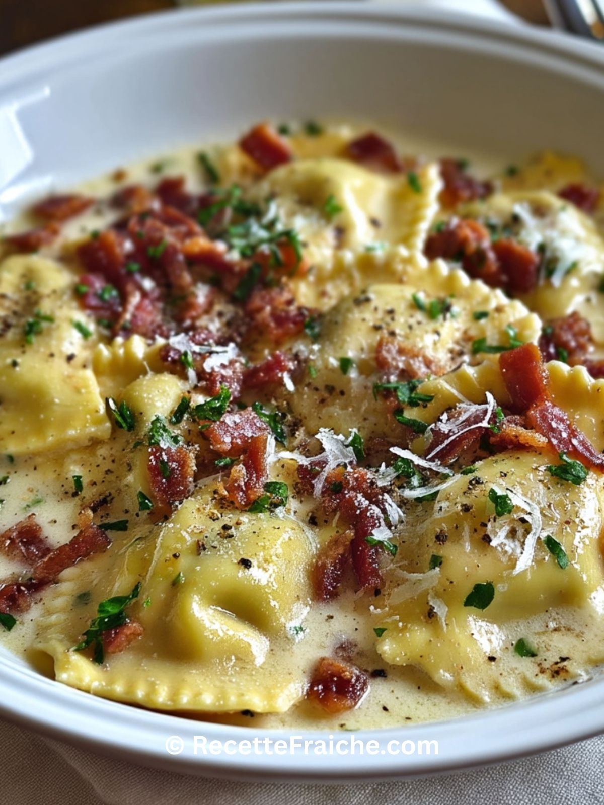 Ce plat, c’est la preuve qu’on peut marier la simplicité à la générosité : des ravioli frais, une sauce crémeuse au parmesan, des lardons dorés… Le genre de recette qui réchauffe l’ambiance autour de la table et qui plaît à tous, petits comme grands. Préparez-vous à recevoir des compliments… et sûrement quelques demandes de rab !