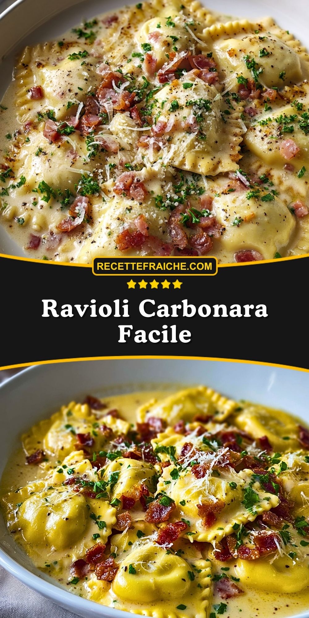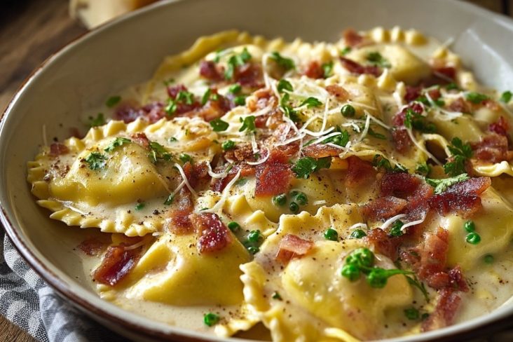 Ravioli Carbonara Facile : un plat express et ultra crémeux, parfait pour un dîner rapide. Des ravioli frais, des lardons, une sauce onctueuse au parmesan, le tout prêt en 15 minutes pour régaler toute la famille.