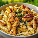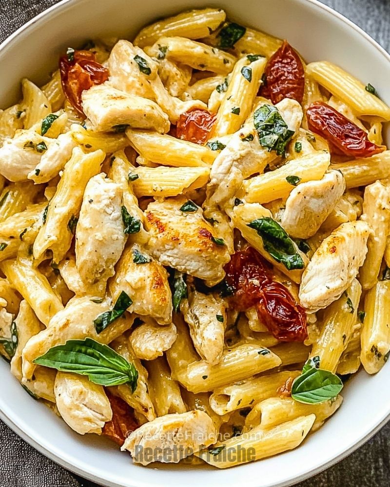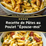 Je dois vous prévenir : cette recette pourrait bien déclencher une demande en mariage ! Ces pâtes au poulet « Épouse-moi » portent bien leur nom, avec leur sauce crémeuse à l’ail, au parmesan et aux épices qui envoûtent dès la première bouchée. Le poulet doré et fondant apporte une touche irrésistible, et chaque fourchette de pâtes enrobe parfaitement cette sauce onctueuse et parfumée.