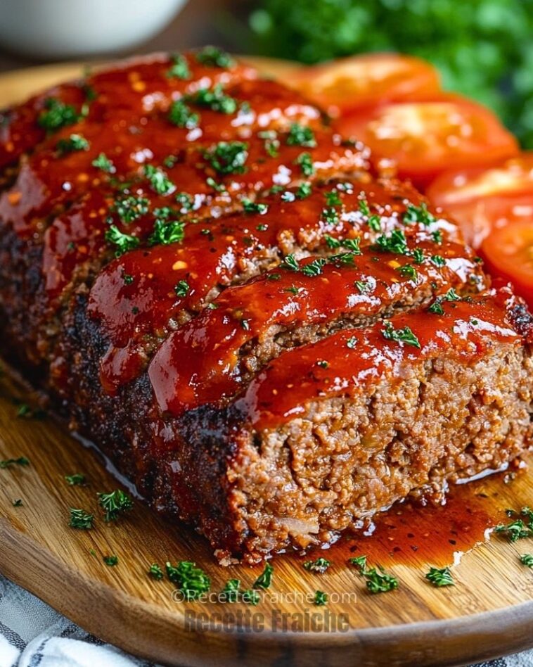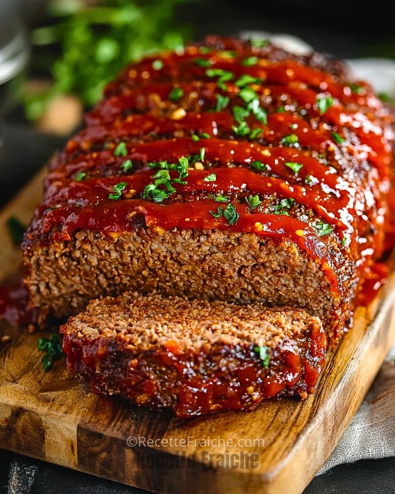 Ces ingrédients simples se combinent pour donner un pain de viande tendre, bien assaisonné et recouvert d’une sauce légèrement sucrée et caramélisée.