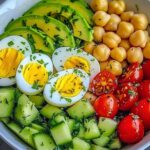 J’adore préparer cette salade fraîche et colorée, surtout lorsque j’ai envie d’un repas léger, sain et gourmand. L’association de l’avocat crémeux, des œufs durs riches en protéines, des pois chiches rassasiants et des légumes croquants en fait un plat aussi délicieux que nourrissant. Un filet de jus de citron et des herbes fraîches viennent relever les saveurs pour un résultat tout simplement irrésistible.