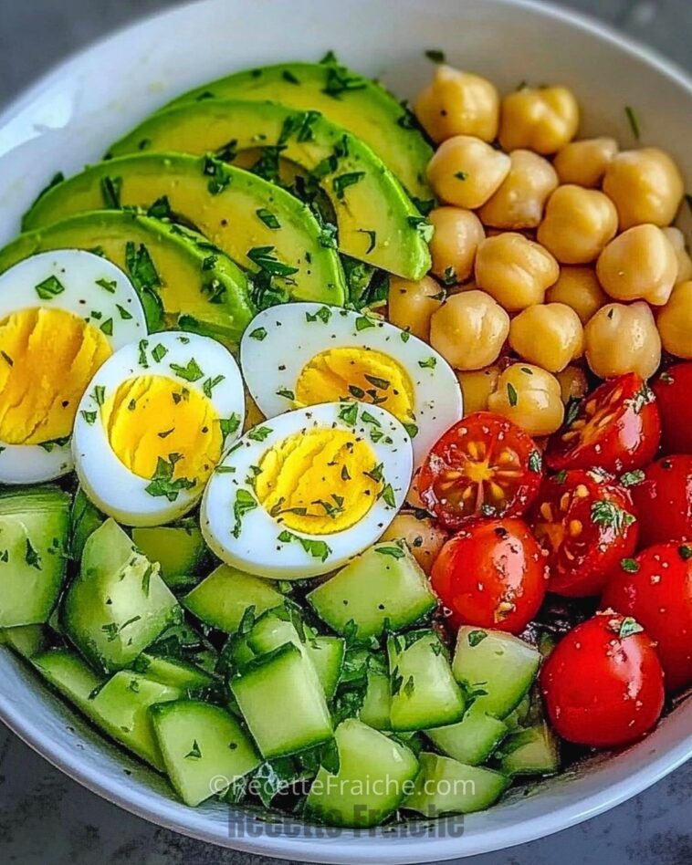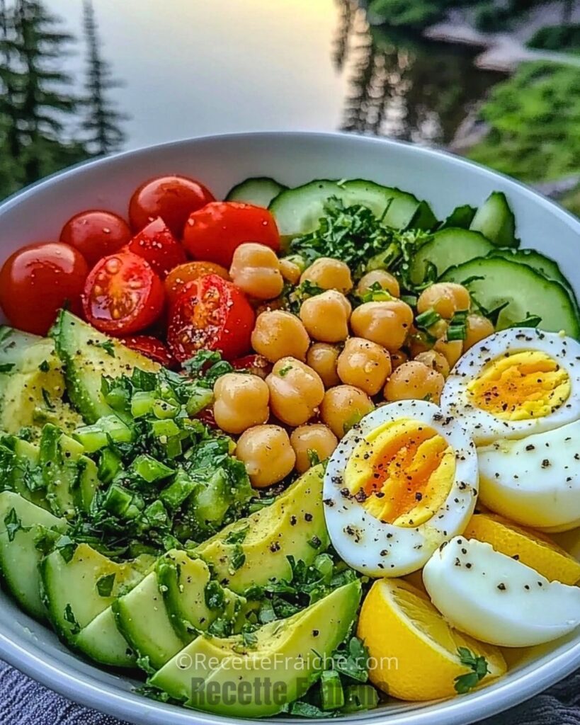 Une salade fraîche, équilibrée et rapide à préparer, idéale pour un repas sain et gourmand. L’association de l’avocat crémeux, des œufs riches en protéines, des pois chiches rassasiants et des légumes croquants en fait un plat savoureux. Relevée par un filet de citron et des herbes fraîches, cette salade est parfaite pour toutes les occasions.