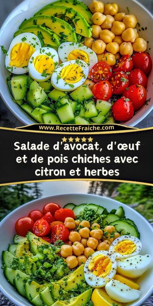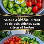 Cette salade d’avocat, d’œuf et de pois chiches est fraîche, nourrissante et rapide à préparer. Parfaite pour un repas équilibré, elle peut être personnalisée selon vos envies. N’oubliez pas de l’enregistrer sur Pinterest et de la partager avec votre famille et vos amis pour leur faire découvrir cette délicieuse recette !