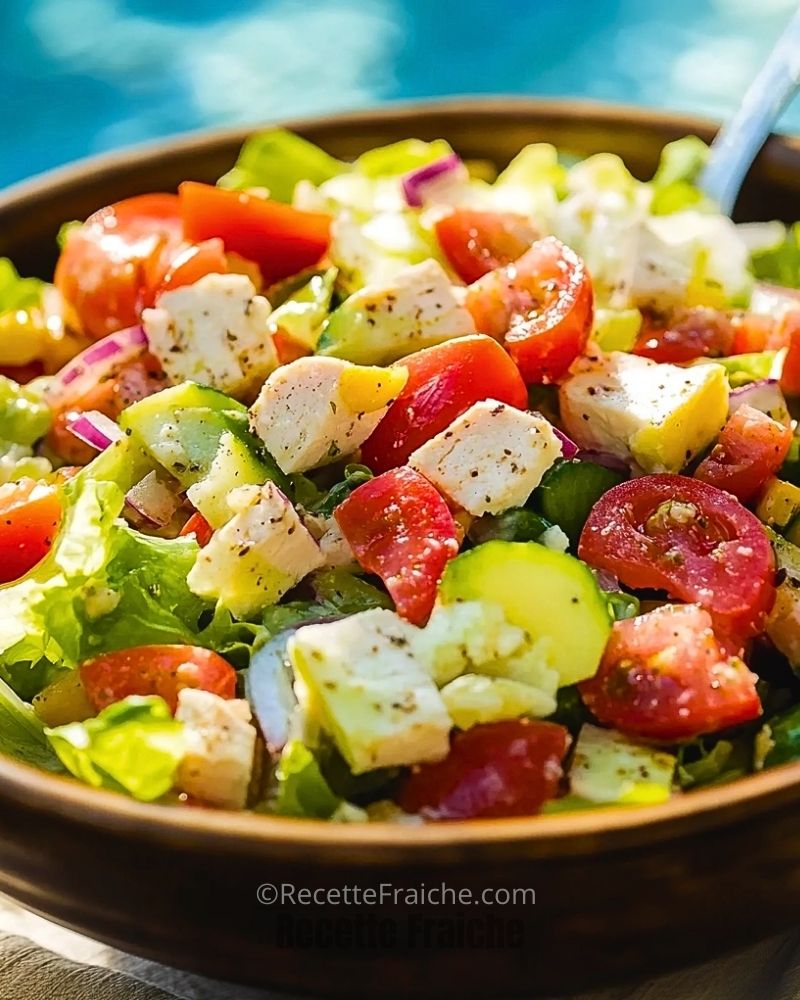 Ce que j’aime particulièrement dans cette salade, c’est son équilibre parfait entre textures et saveurs. Les tomates juteuses, le croquant des laitues, le piquant des oignons rouges et le fondant du fromage créent une explosion en bouche, sublimée par une vinaigrette crémeuse à l’italienne. Un véritable voyage gustatif qui plaira à tous les amateurs de cuisine méditerranéenne !
