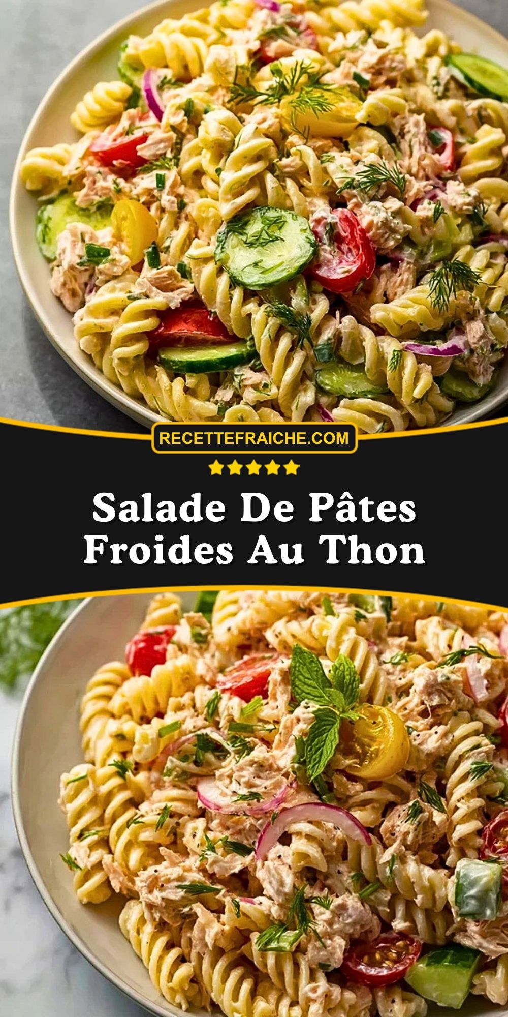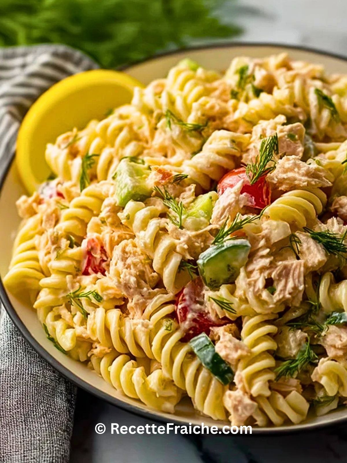 Salade De Pâtes Froides Au Thon fraîche, crémeuse et facile à préparer, parfaite pour un repas d’été, un pique-nique ou une lunch box. Cette recette rapide associe pâtes froides, thon, concombre, tomates cerises, maïs et sauce citronnée pour un plat complet, savoureux et pratique à faire à l’avance pour toute la famille.