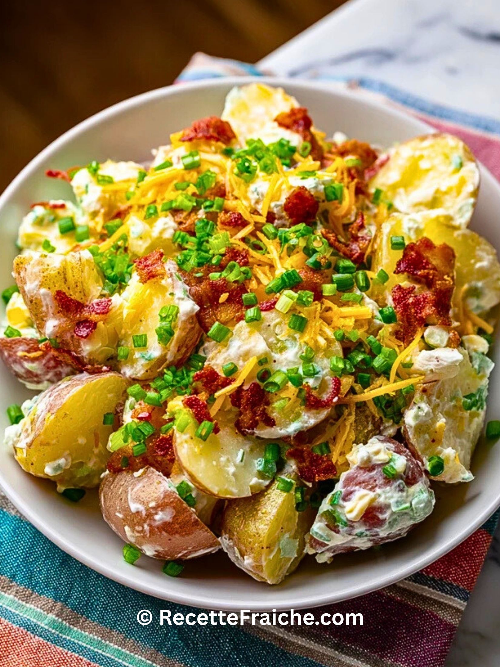 Transférez la salade dans votre plat de service. Parsemez le dessus avec le reste de bacon croustillant, de cheddar, d’oignons verts et de ciboulette pour une belle présentation. Servez tiède ou à température ambiante.