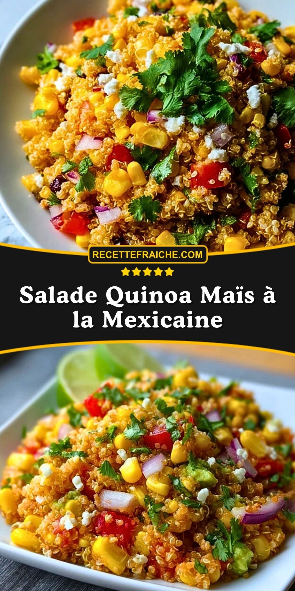 Salade quinoa maïs à la mexicaine : une recette saine, fraîche et colorée, prête en moins de 30 minutes. Riche en protéines, sans gluten, parfaite en plat complet, pique-nique ou accompagnement. Saveurs mexicaines, croquant et douceur garantis.