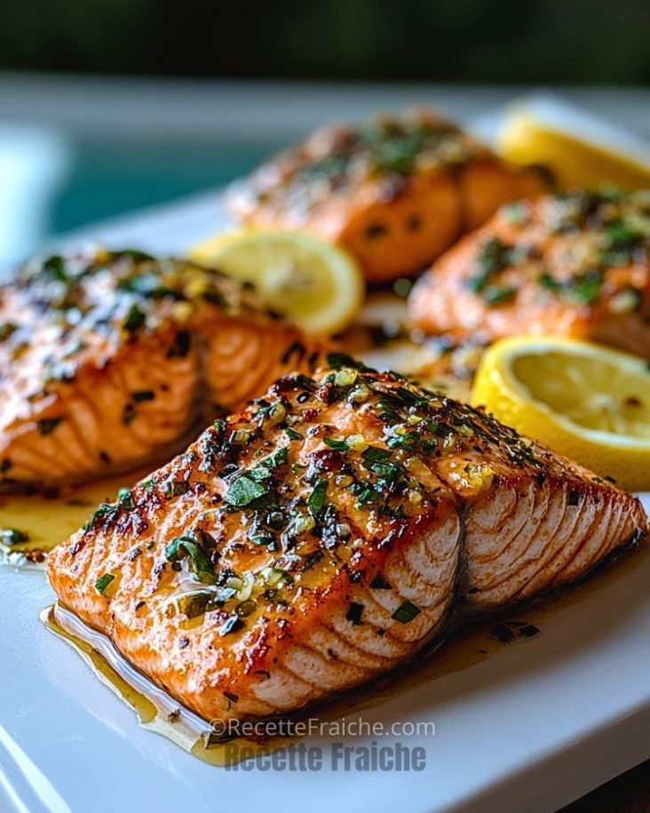 Retirez du feu et parsemez de persil frais haché. Servez immédiatement avec des tranches de citron pour une touche de fraîcheur supplémentaire. Ce saumon s’accompagne parfaitement de légumes sautés, de riz ou d’une purée légère.