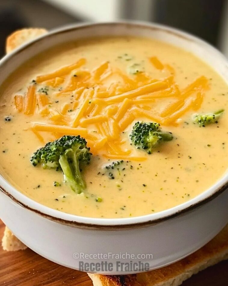 Versez la soupe bien chaude dans des bols. Ajoutez quelques morceaux de brocoli, du cheddar râpé et des croûtons pour encore plus de gourmandise. Servez immédiatement et profitez de cette délicieuse soupe réconfortante !