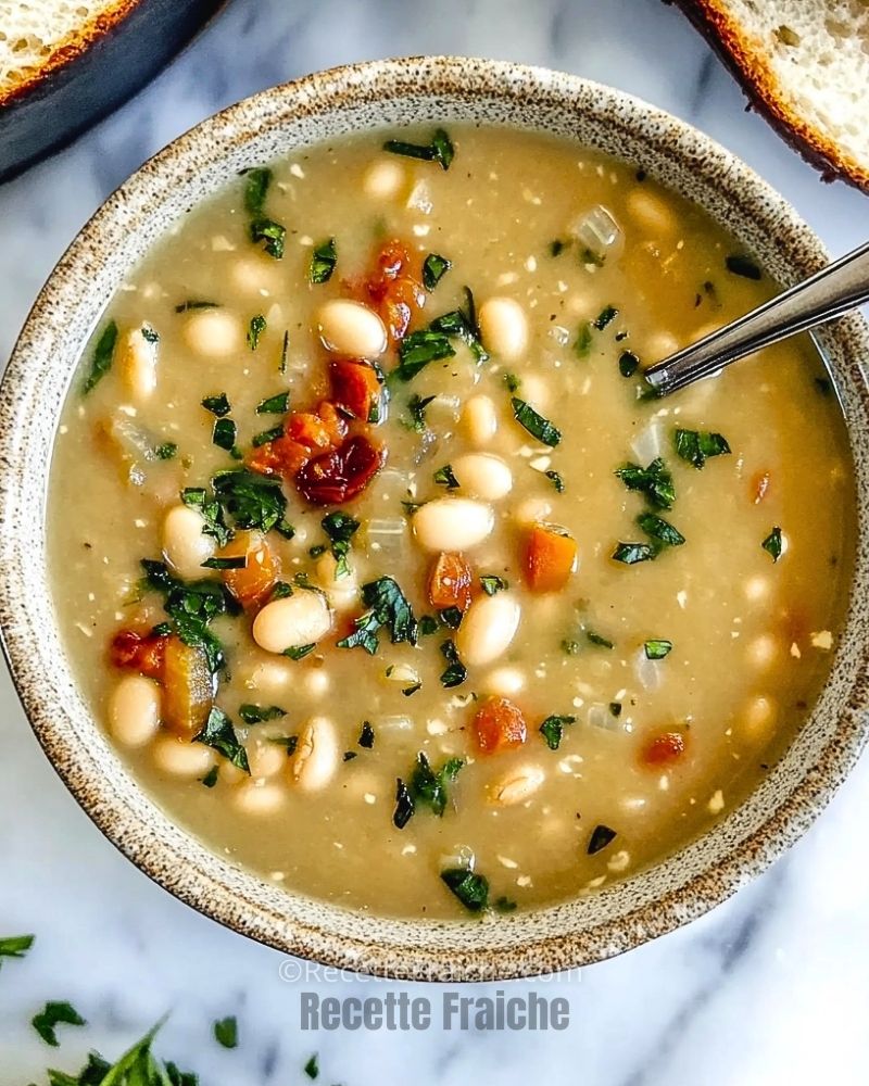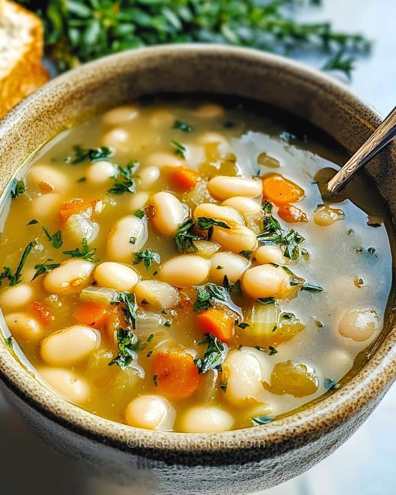Savourez cette soupe de haricots toscane, une recette traditionnelle italienne à base de haricots blancs, de légumes et d’herbes aromatiques. Facile à préparer, nourrissante et réconfortante, elle est idéale pour un repas sain et équilibré. Parfaite avec une tranche de pain grillé et un filet d’huile d’olive.