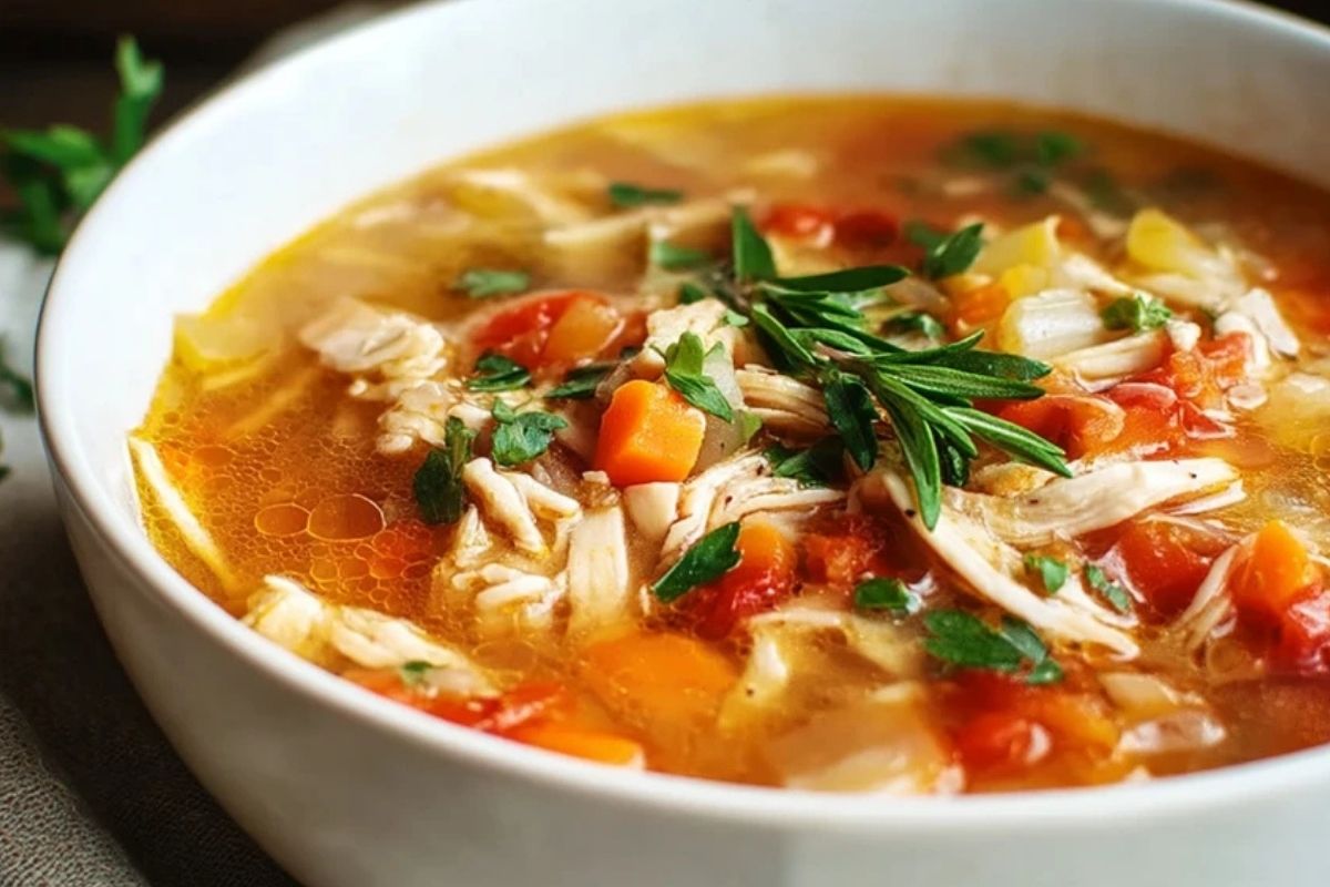 Cette soupe combine le fondant du poulet, le croquant des légumes et la légèreté d’un bouillon maison. Elle est facile à personnaliser, riche en nutriments, parfaite pour un dîner léger ou pour se remettre d’un coup de fatigue. Les notes de tomates, de céleri et d’herbes fraîches apportent une touche ensoleillée irrésistible.