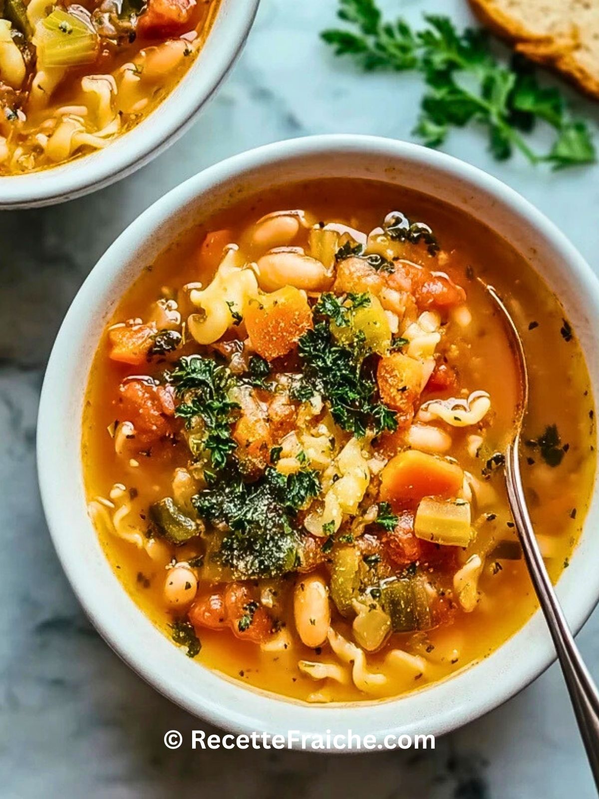 Soupe italienne végétalienne façon minestrone, riche en légumes colorés, pâtes et haricots blancs dans un bouillon parfumé aux herbes méditerranéennes. Un repas complet, réconfortant et léger, facile à préparer en semaine, parfait pour réchauffer toute la famille les soirs frais d’automne ou d’hiver.