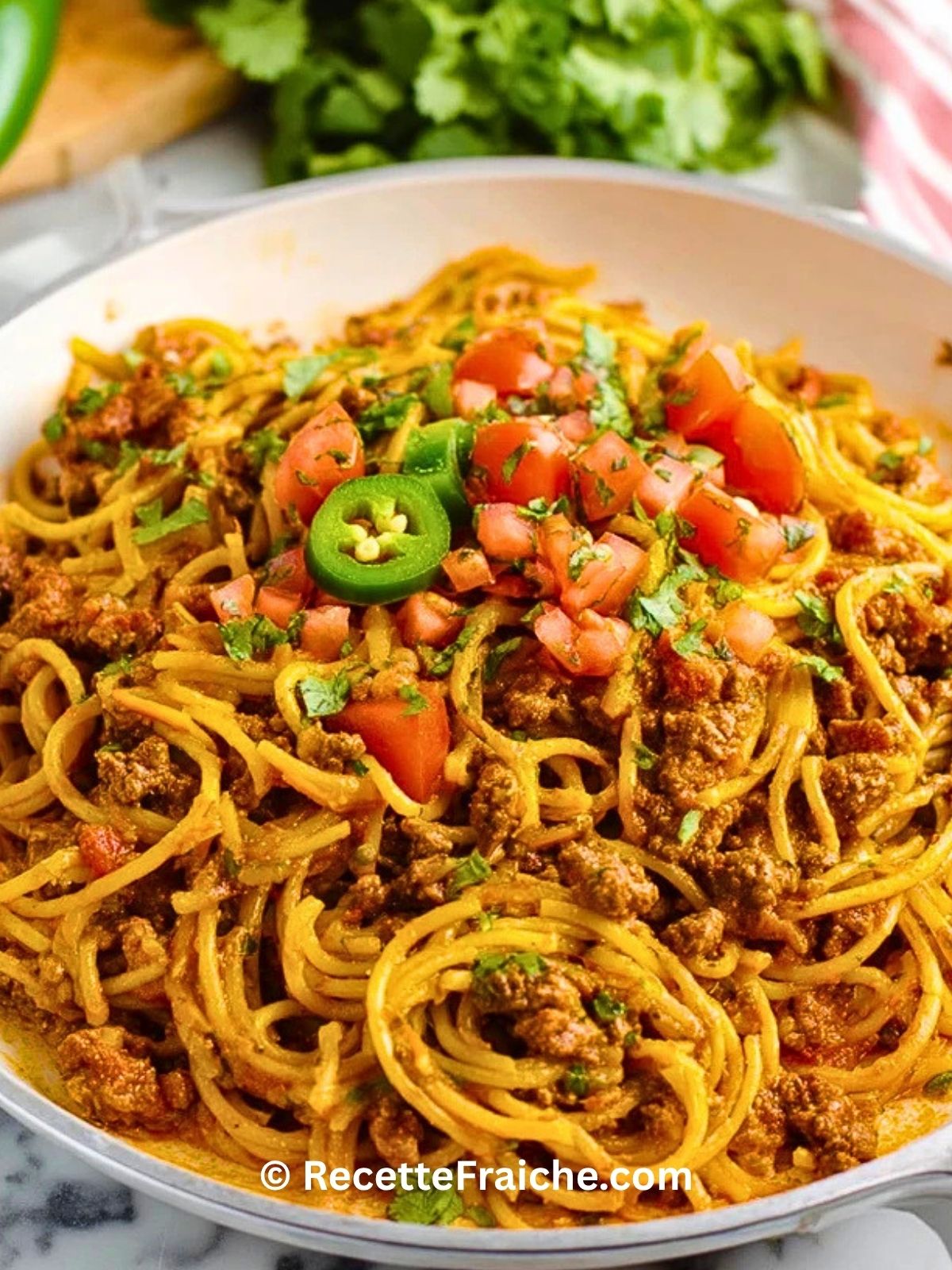 J’aime aussi cette recette parce qu’elle marie deux univers que tout le monde adore : les spaghetti et l’esprit généreux des tacos. Le résultat est copieux, convivial et parfait pour les soirs où je veux cuisiner quelque chose de rapide, chaleureux et capable de plaire autant aux enfants qu’aux adultes.