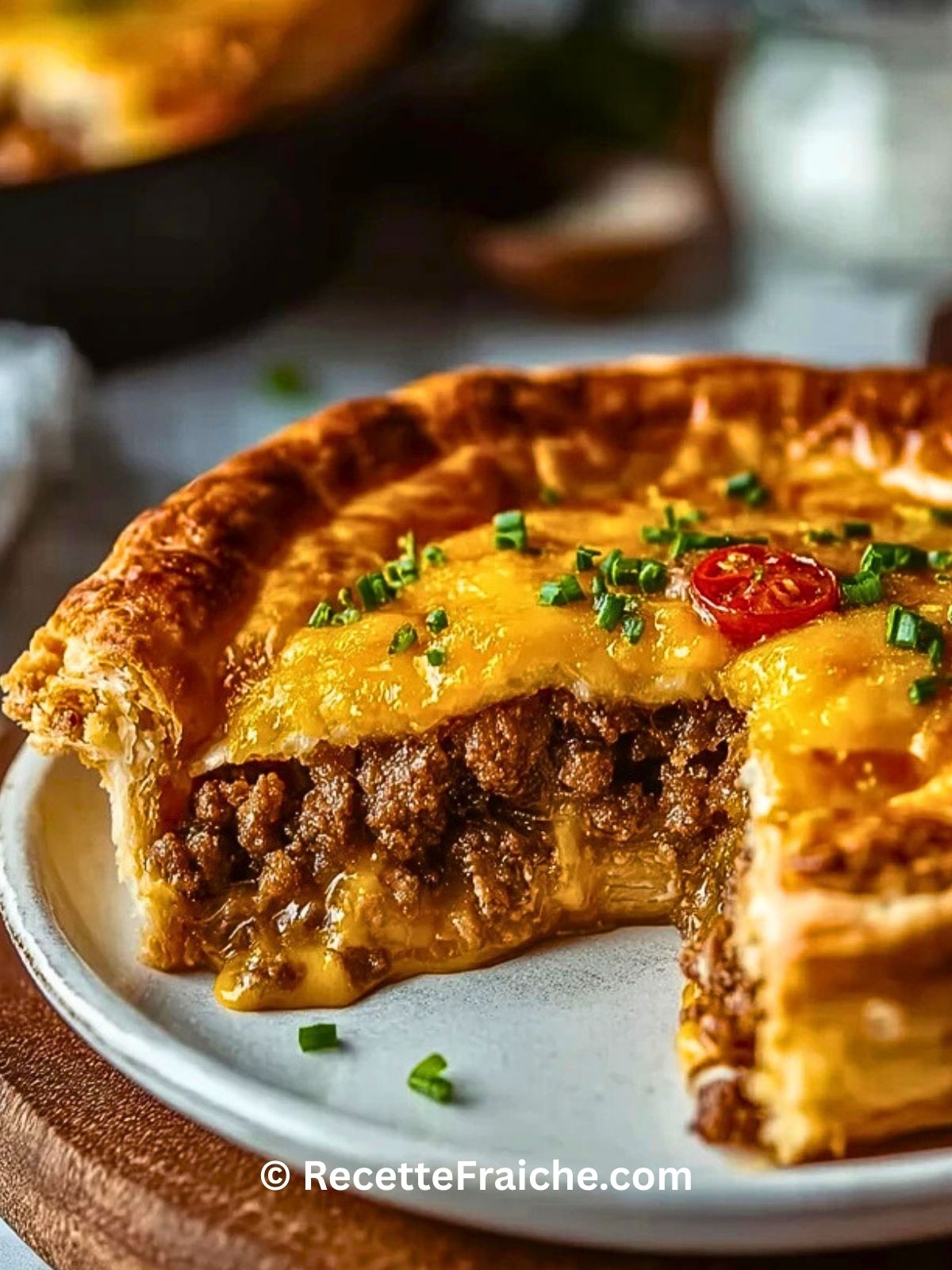 Cette Tarte Au Cheeseburger réunit tout ce qu’on aime dans un bon burger : bœuf haché juteux, cheddar fondant, cornichons, moutarde et ketchup, le tout enfermé dans une pâte dorée et croustillante. Facile à préparer et parfaite à partager, elle se sert aussi bien en dîner familial qu’en plateau télé gourmand avec une simple salade verte croquante.
