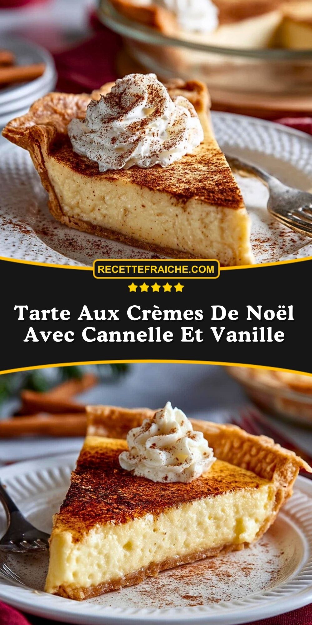 N’oubliez pas d’enregistrer cette recette sur Pinterest et de la partager avec vos proches ! Cette tarte aux crèmes de Noël avec cannelle et vanille est parfaite pour apporter un peu de magie aux fêtes.