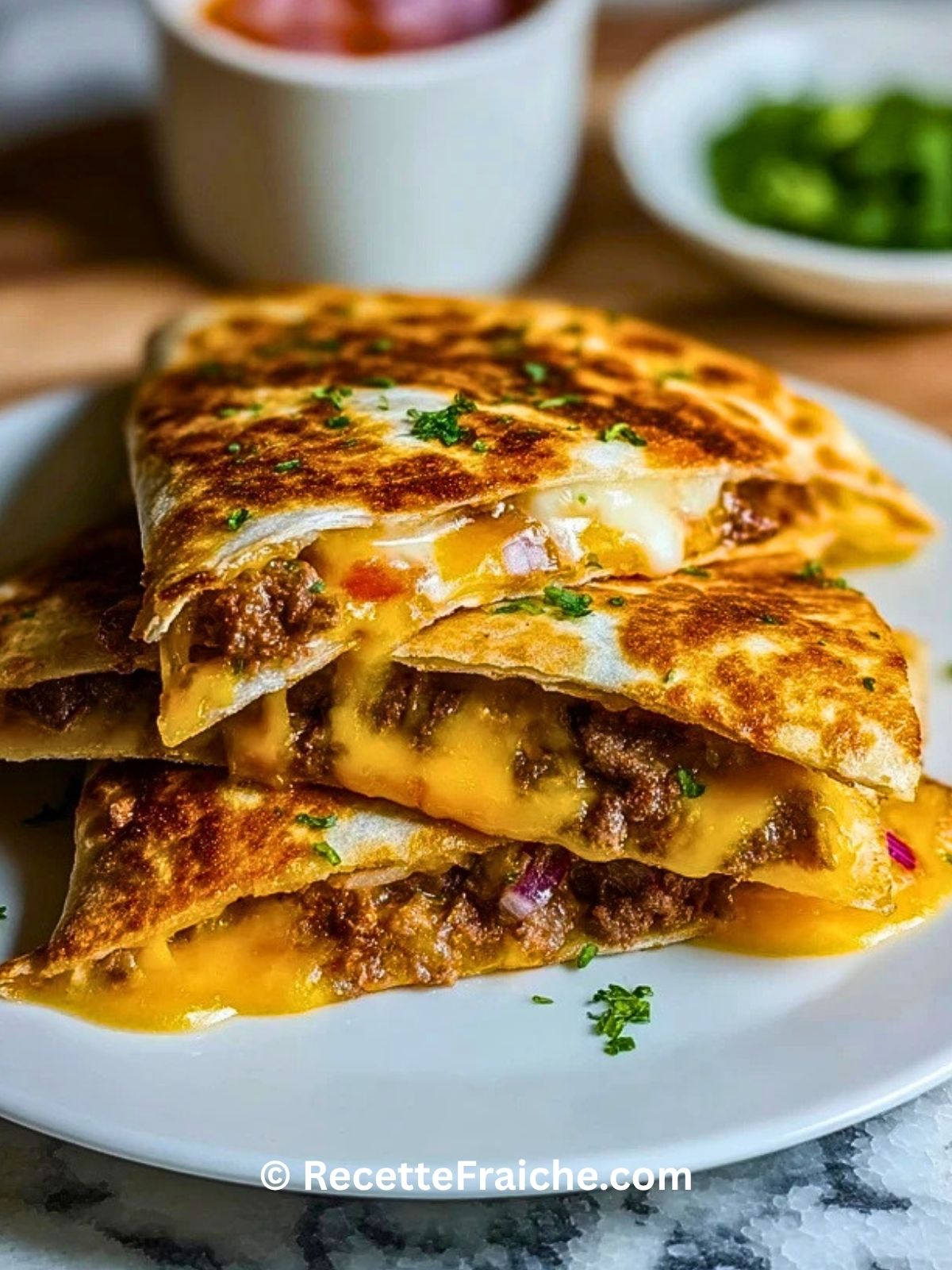Une portion peut varier selon la taille des tortillas et la quantité de fromage utilisée, mais on peut estimer qu’elle apporte environ 620 à 720 kcal. Elle contient en moyenne une belle part de protéines grâce au bœuf, des matières grasses issues du fromage et du beurre, ainsi qu’une quantité modérée de glucides apportés par la tortilla. Pour une version plus légère, il est possible de réduire le fromage ou d’utiliser des tortillas plus petites.