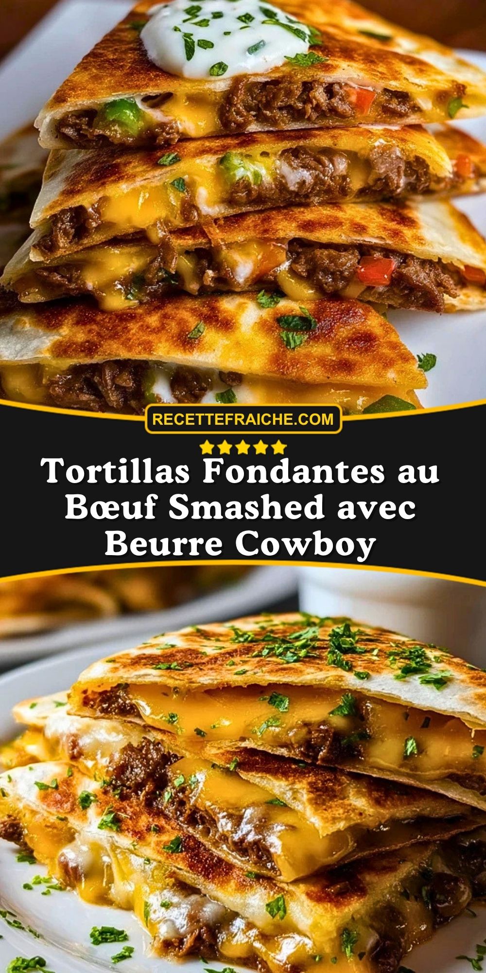 Ces tortillas fondantes au bœuf smashed avec beurre cowboy sont croustillantes à l’extérieur, ultra fromagères et pleines de saveurs. Cette recette facile et rapide associe bœuf haché, cheddar fondant, mozzarella, ail, herbes fraîches et tortillas dorées pour un repas gourmand, convivial et parfait pour le dîner.