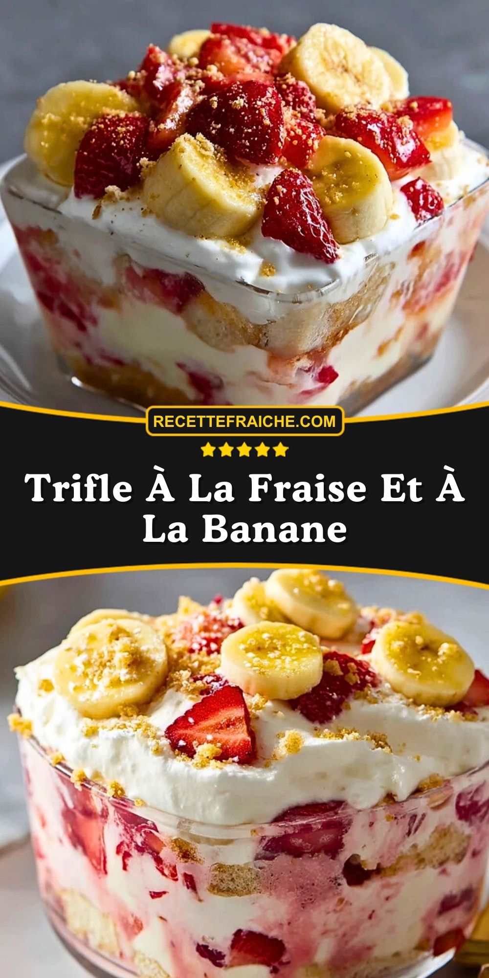 Keywords: trifle à la fraise et à la banane, dessert aux fruits, trifle facile, dessert sans cuisson, recette mascarpone fraise banane