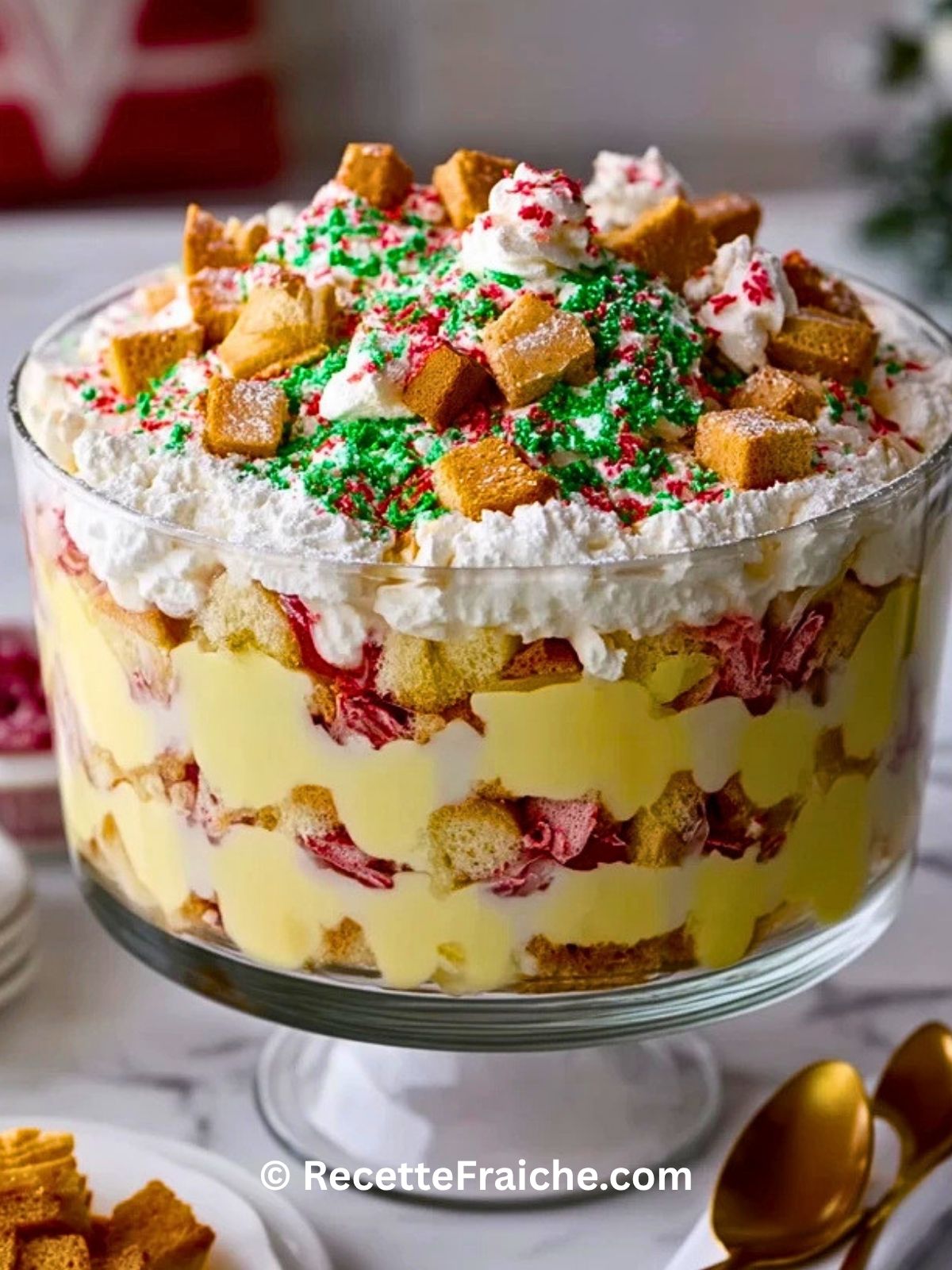 C’est une excellente idée pour Noël, un brunch hivernal ou un repas de famille, car il se partage facilement. Chacun plonge sa cuillère dans les différentes couches et profite d’un dessert riche, crémeux et joyeux, avec une présentation qui rappelle un petit paysage de fête.