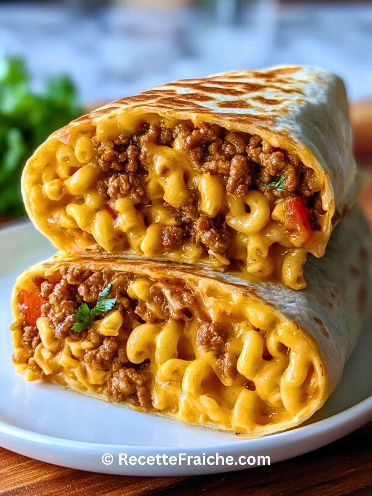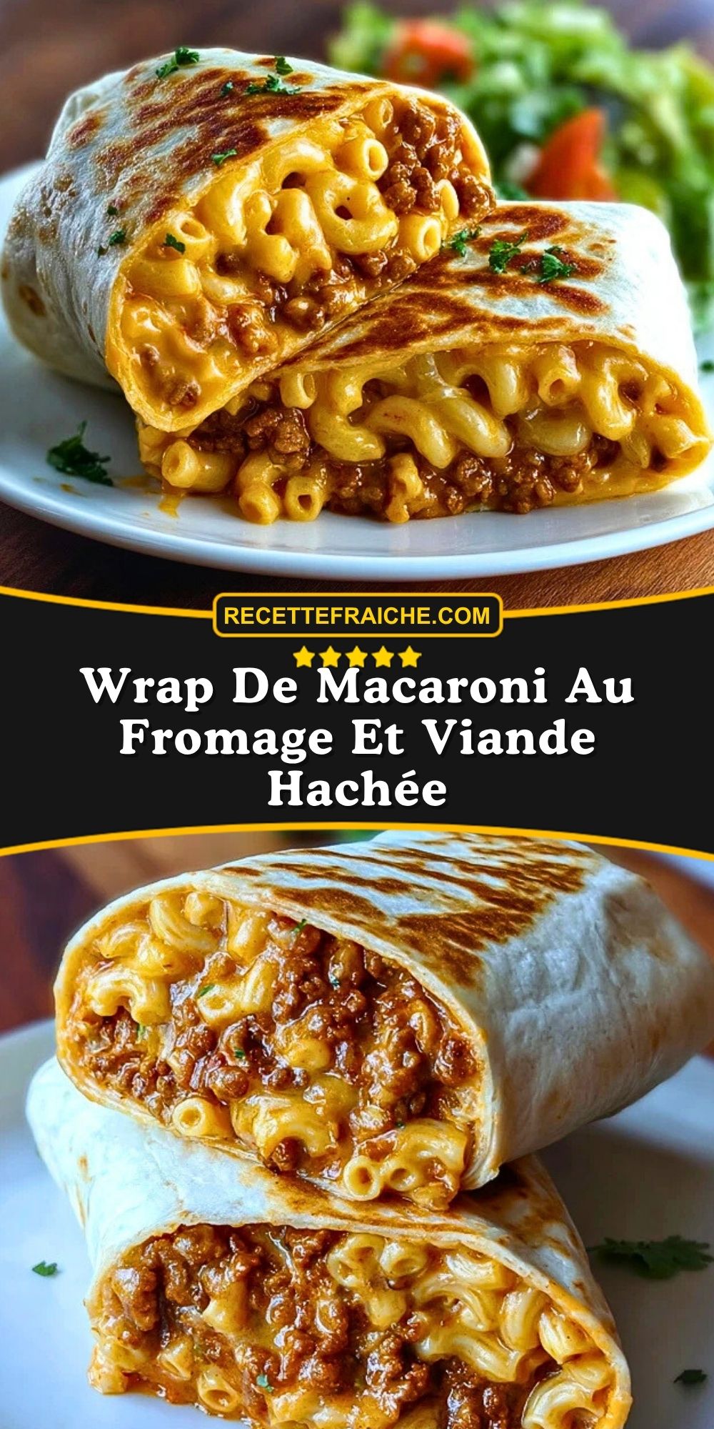 Keywords: wrap de macaroni au fromage et viande hachée, wrap gourmand, recette facile, dîner rapide, macaroni au fromage, tortilla croustillante, recette au bœuf haché